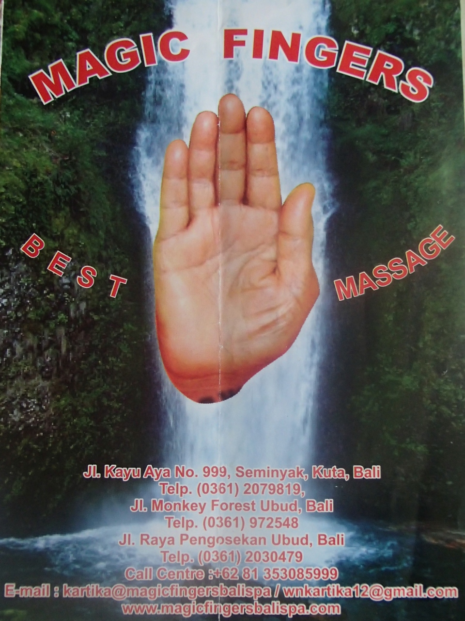 ハンドパワー/手のひらの看板が目印のマッサージ店。ハノマン通りの終点・ウブドのCoCo Supermarketから、Arma Museumへと向かうJalan Raya Pengosekanを進むとすぐ右手にある。ウブド観光案内所に近いモンキーフォレスト通り沿い、スミニャックにも支店あり。