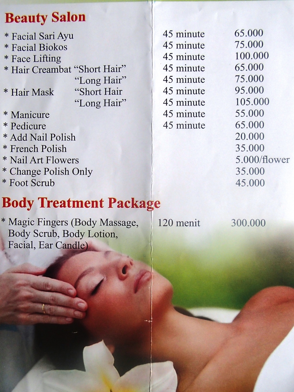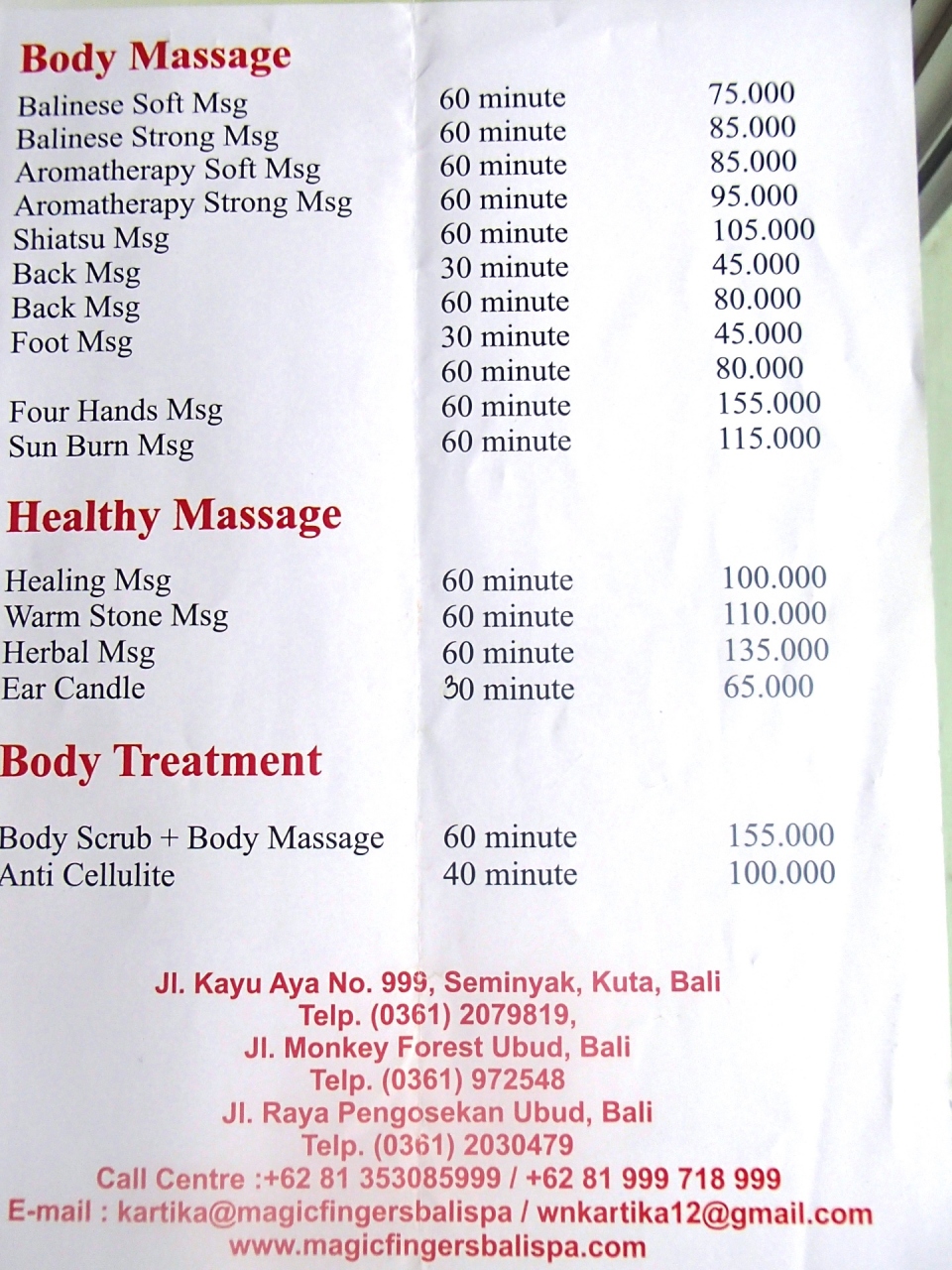 Pengosekan通りの支店は22時までとのことだが、閉店時間なのか最終受付時間なのか不明。激安ではないが、きちんとした施術室で、マッサージの腕もよい。バリニーズ・ハード・マッサージRp85,000を受けて夢心地となり、チップ含めてRp100,000渡す大盤振る舞い。バリニーズのソフトは60分Rp75,000、フットマッサージ60分Rp80,000などなど。
