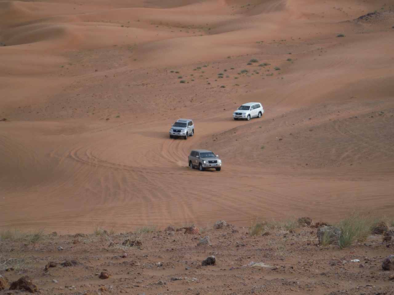 アップダウンは激しく、ジェットコースターみたいにどれくらい登って、どれくらい落ちるかは見えますが、デザートサファリの場合は、頂上までに登った高さと落ちる高さは同じではないので、頂上から下に向かった時にはビックリするかもしれません。