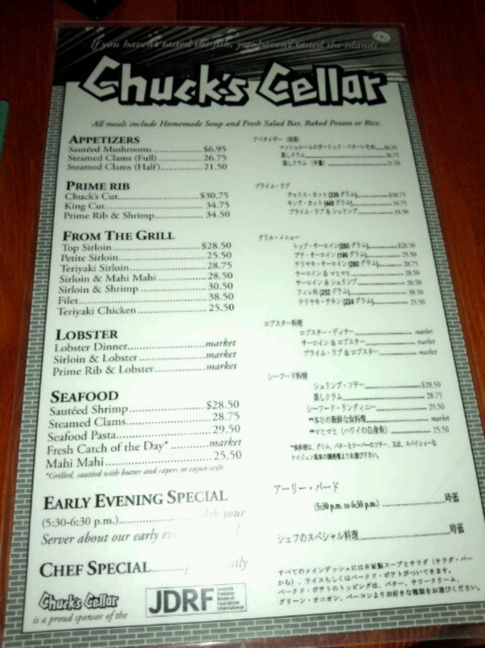 ワイキキには有名なステーキ屋さんもたくさんありますが、チャックス・セラーはリーズナブルな値段でとても質の良いお肉が食べられるのでおすすめです。