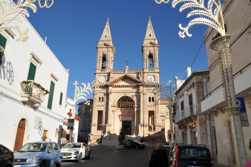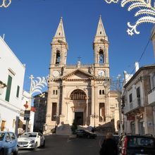 アルベロベッロの中心部にある大きな教会で、立派な塔が印象的。トゥルッリ街までは徒歩5分程度です。街歩きの拠点となるでしょう。夜になると周囲の道路がライトアップされ、教会自体もライトアップされてとてもきれいでした。中は普通の教会です。