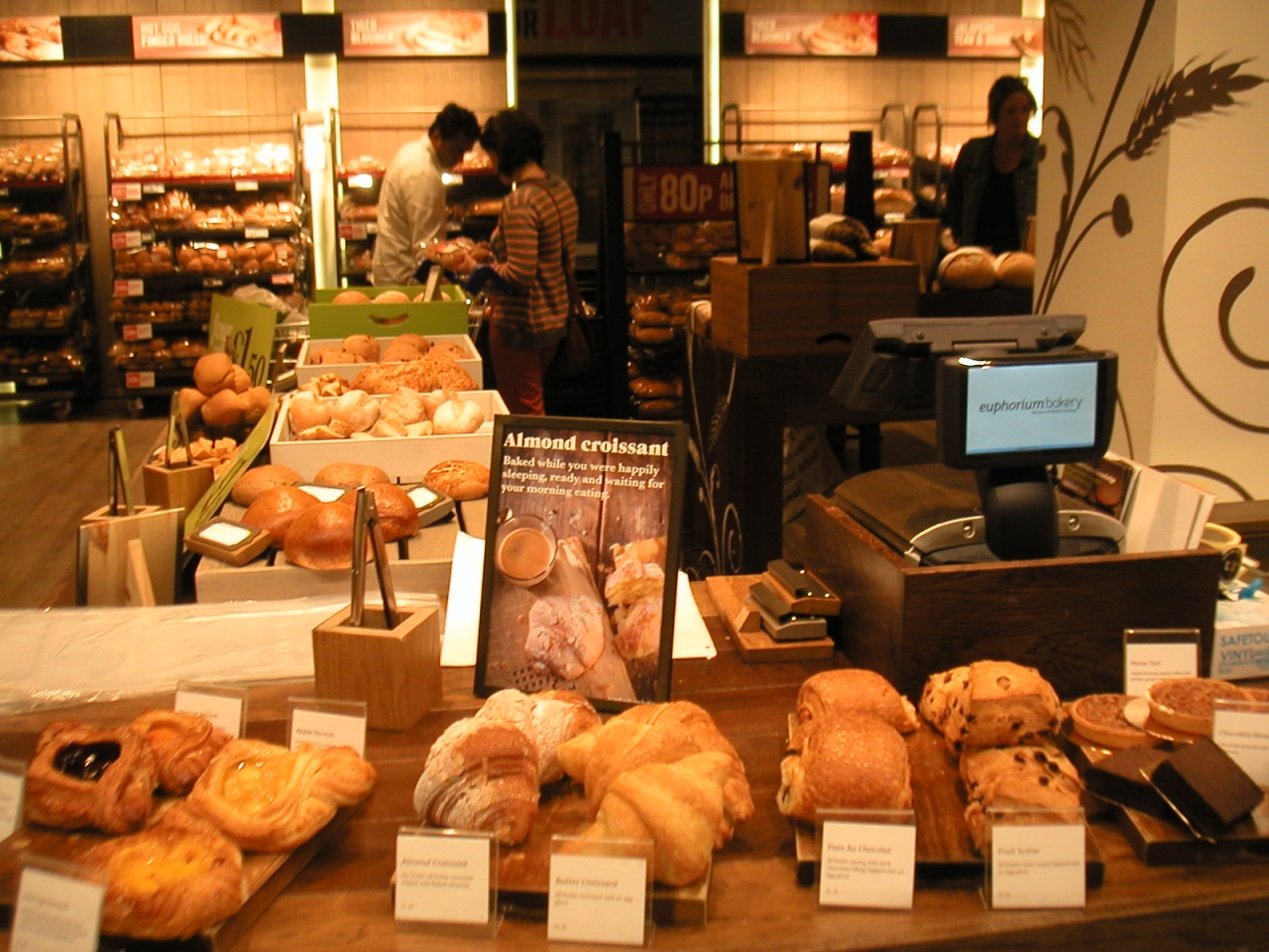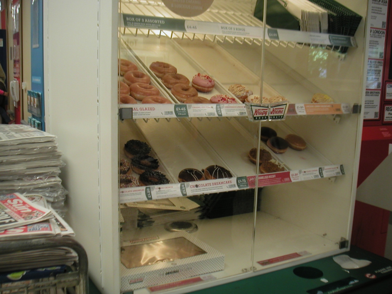 これも最近のことのようですが、入り口にクリスピークリームドーナッツのセルフサービスのショーケースがありました。今回英国旅行で気がついたのは、スーパーマーケットや高速道路のドライブインに、ずいぶんクリスピークリームドーナッツの売り場が出来ていることです。多種類でなく、数種類のドーナッツのセルフサービスのトレイと、定番の1ダース詰め合わせボックスのみの販売です。