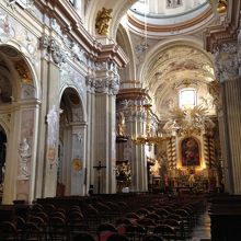 19時過ぎに行ったらミサ中でした、ここに来る前に他の教会にも寄りミサ中で観光客お断りとなっていたので、この教会に来ましたが入れず入口から少し見ました白い内装で宮殿を思わせる教会した。ポーランド語は読めませんが6:00からほぼ毎時になにかがある様な記載でした、結構ミサが長く諦めて他の教会に行って再度よりましたがミサが続いており帰りました。次の日7:20に行ったらミサがちょうど終わって照明が少し落ちましたが中を見れました。柱の像は立体でなく3Dに書かれたものでした上手ではないけれど教会にしては斬新。