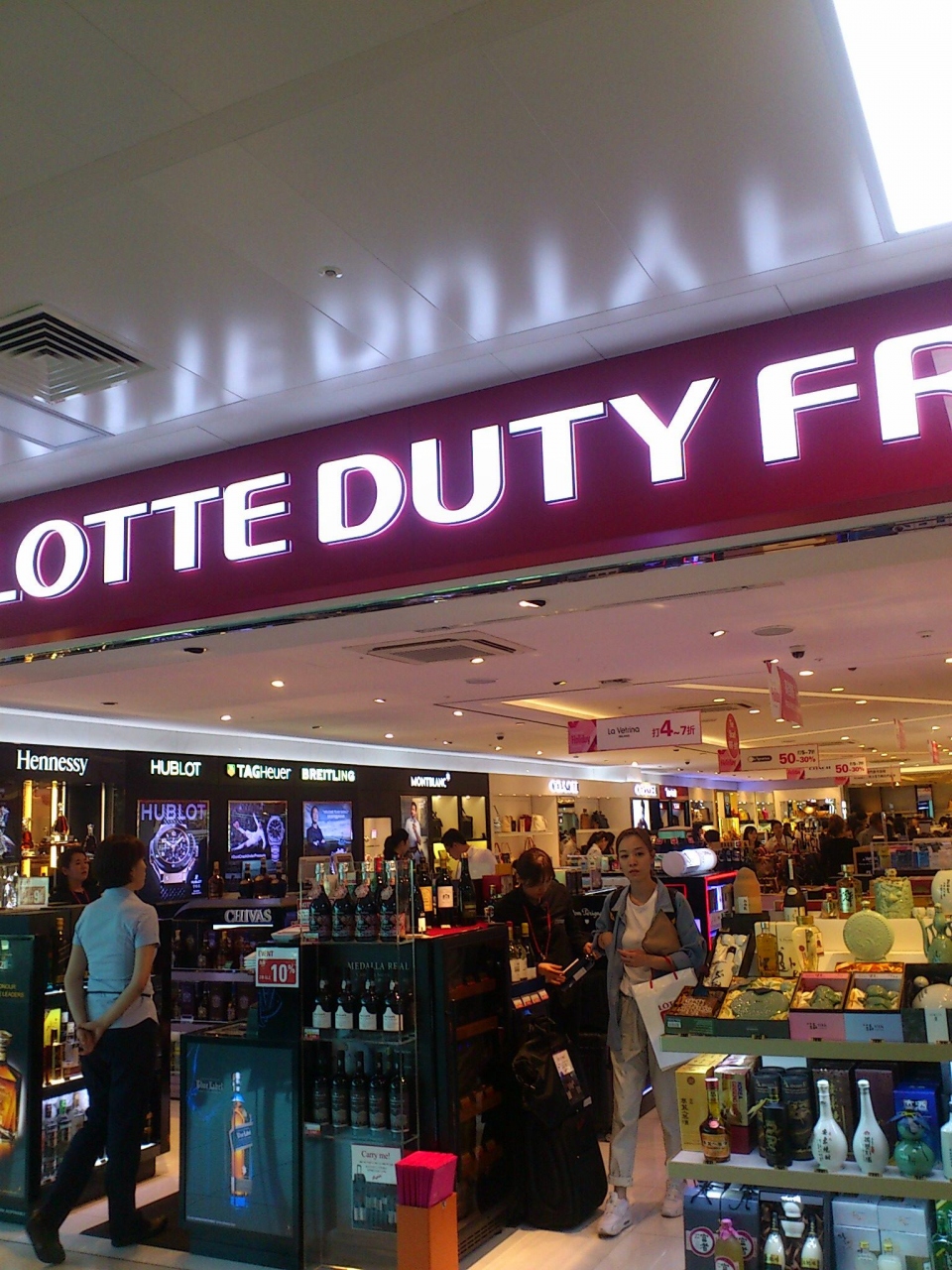 金浦空港の出国手続きを過ぎた管理区域内にあります。日本でのロッテはお菓子メーカーのイメージが強いですが、韓国では小売業を中心とした財閥で、あちこちにロッテ系のお店があります。免税店としては良く見るありきたりのお店で、ただ派手なのが取り柄です。特に欲しいものが見つからなかったので、タバコを1カートン購入しました。