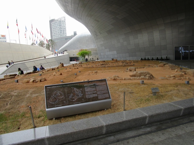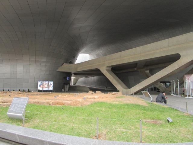 東大門遺構展示場 は、ここが東大門運動場だったころには地下にあったものを、工事のために掘り起こしたら出てきた・・・という遺構です。