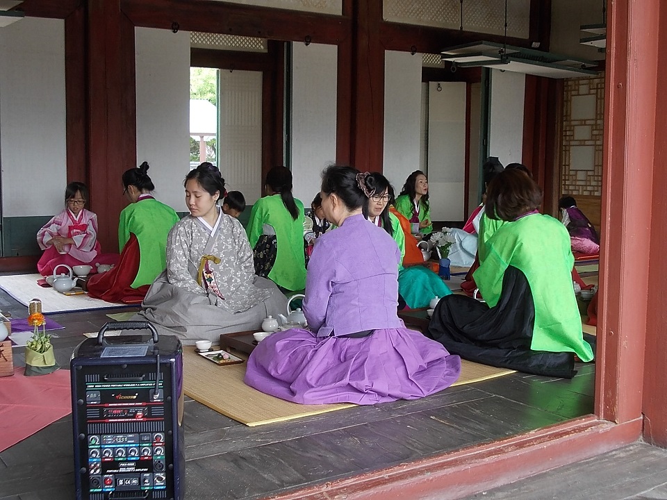 ちょうど韓国茶の実演がおこなわれておりまして、韓服の方々が伝統的な作法にのっとった茶道をなさっている様子を見学させていただくことがかないました。