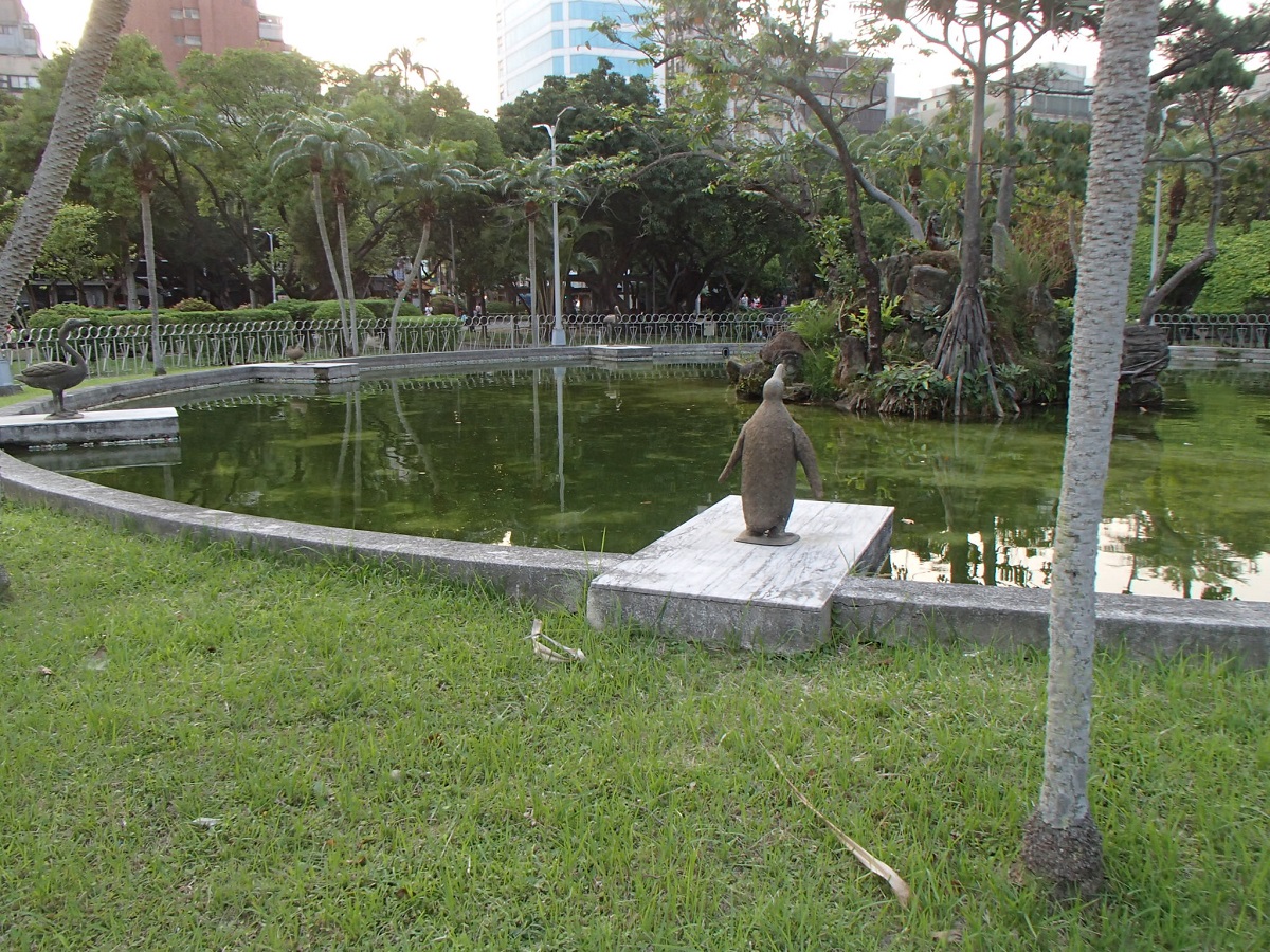 中華風の建物が建つ池と動物のオブジェが置いてある池です。