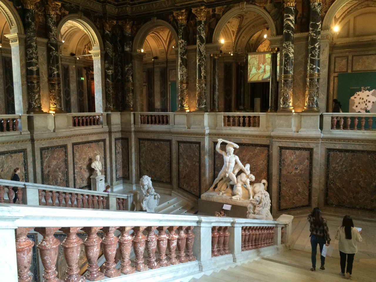 ハプスブルク家のコレクションが元になっている宮廷美術館で、1881年に建てられた新古典主義的に立派な建物です。ヨーロッパの多くの美術館が、昔の宮殿や病院などの建物を改築、改装して美術館にしていますが、ここは初めから美術館として作られただけに、絵を鑑賞する環境として最高です。ブリューゲル、ベラスケス、フェルメール、デューラー、ルーベンス、ラファエロ、ホルバイン、ティツィアーノ、コレッジオ、ソリメーナ、ムンカーチ、クリムトと蒼々たるコレクションを有しています。絵だけではなく、ここのオススメは玄関ロビーに真上にあるカフェです。カフェスペースそのものが美術品と言え、こんな空間でお茶を楽しめるなんて、なんとオーストリアは文化的に豊かなのかを痛感します。「美術史博物館」の真向かいにはマリア・テレジア広場を挟み、ほぼ同じ外観の「ウィーン自然史博物館」が対のように建っています。約3000万点の収蔵品を誇る世界有数の博物館でもあります。施設と展示品は国の持ち物ですが、運営は民間が行っています。ただ入館料収入だけでは賄うことができず、運営資金は主に国の補助金で成り立っています。