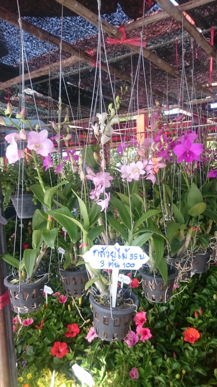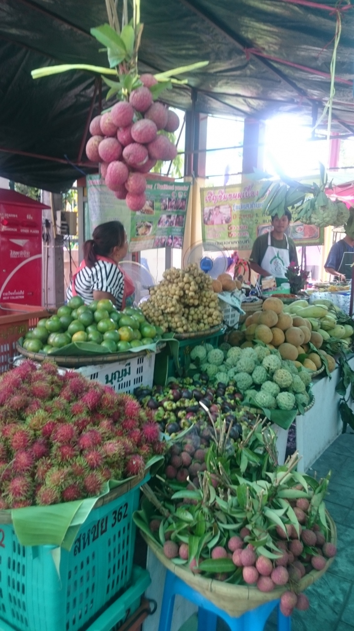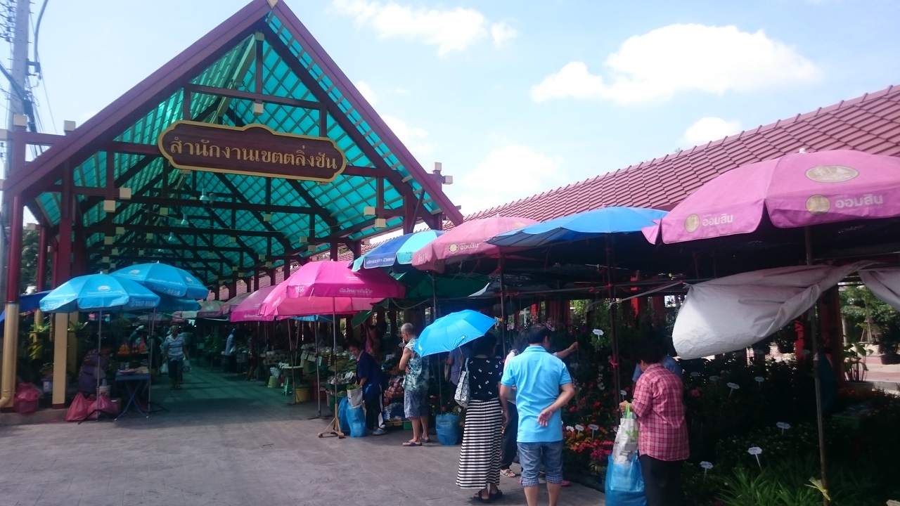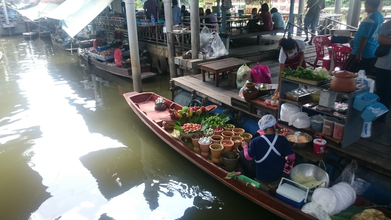 沢山の花や果物、ご当地グルメの屋台が建ち並び、奥には水上レストランがあります。