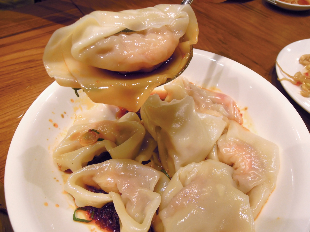 紅油抄手(ピリ辛茹でワンタン 海老)は、最初八角の匂いがするのでちょっとたじろぎますが、口に入れると不思議なことに八角臭さは消え、スパイシーでいくらでも食べれます。辛いの苦手な人には少し厳しいかもです。