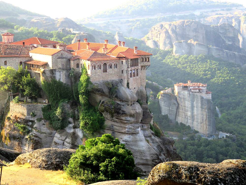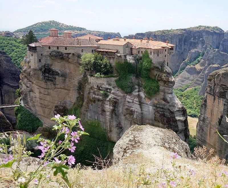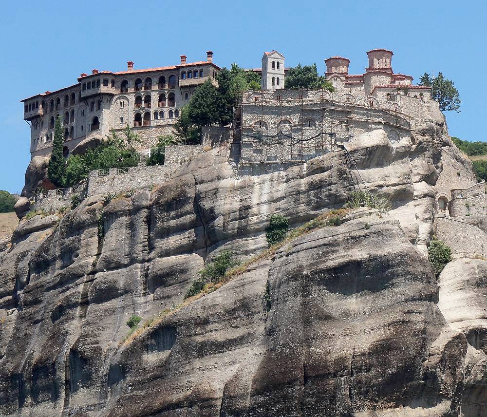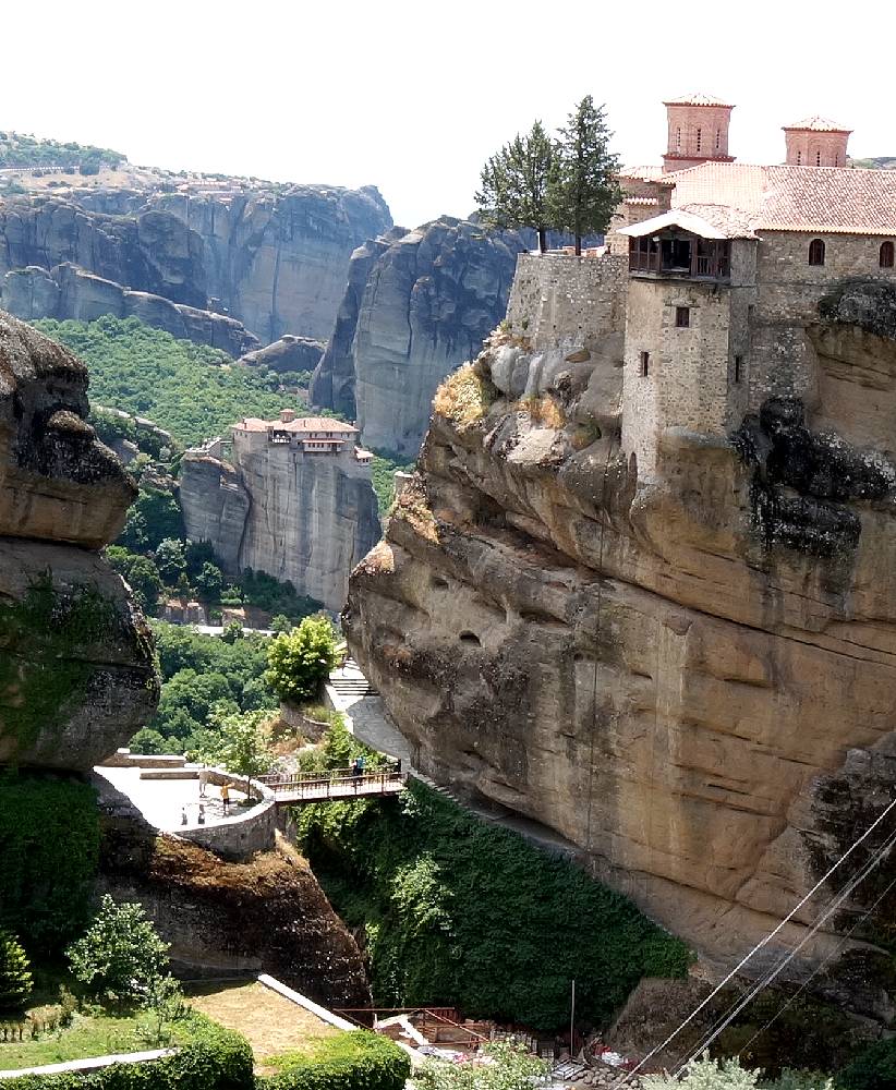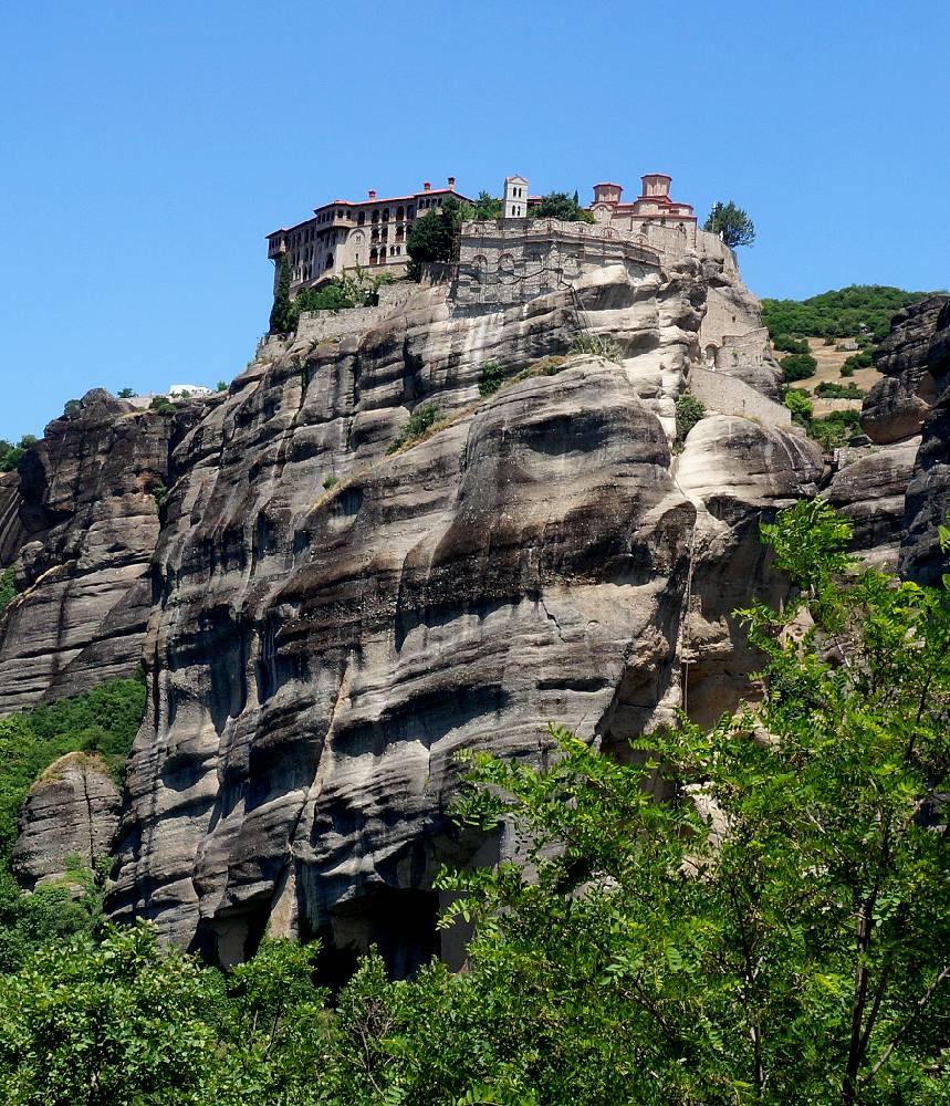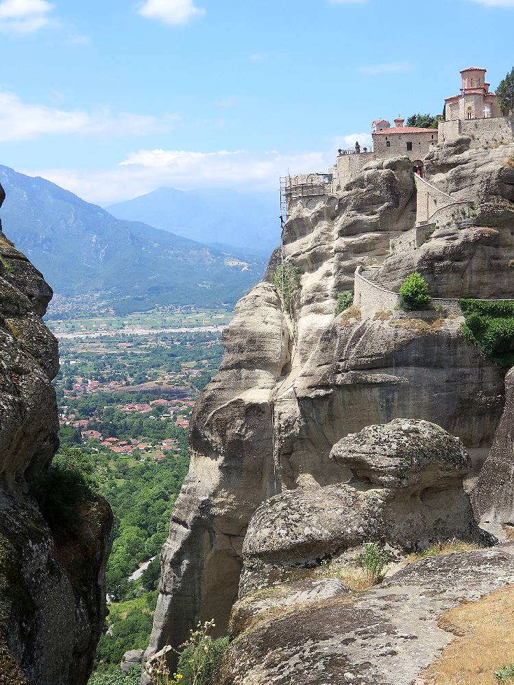 メガロメテオロン修道院の手前、二番目に高い場所にある修道院。メテオロン修道院のテラスからの眺めがベストですが、この修道院を横からまじかに撮影する場所として、メテオロン修道院の駐車場に向かう道の途中で、左側のガードレールの外にある空地がお勧めです。人が乗ることができる大きな石があり、その上からの撮影もお勧め。自撮りもOKです。修道院に渡る橋や岩を削って造られた階段なども良く見えます。