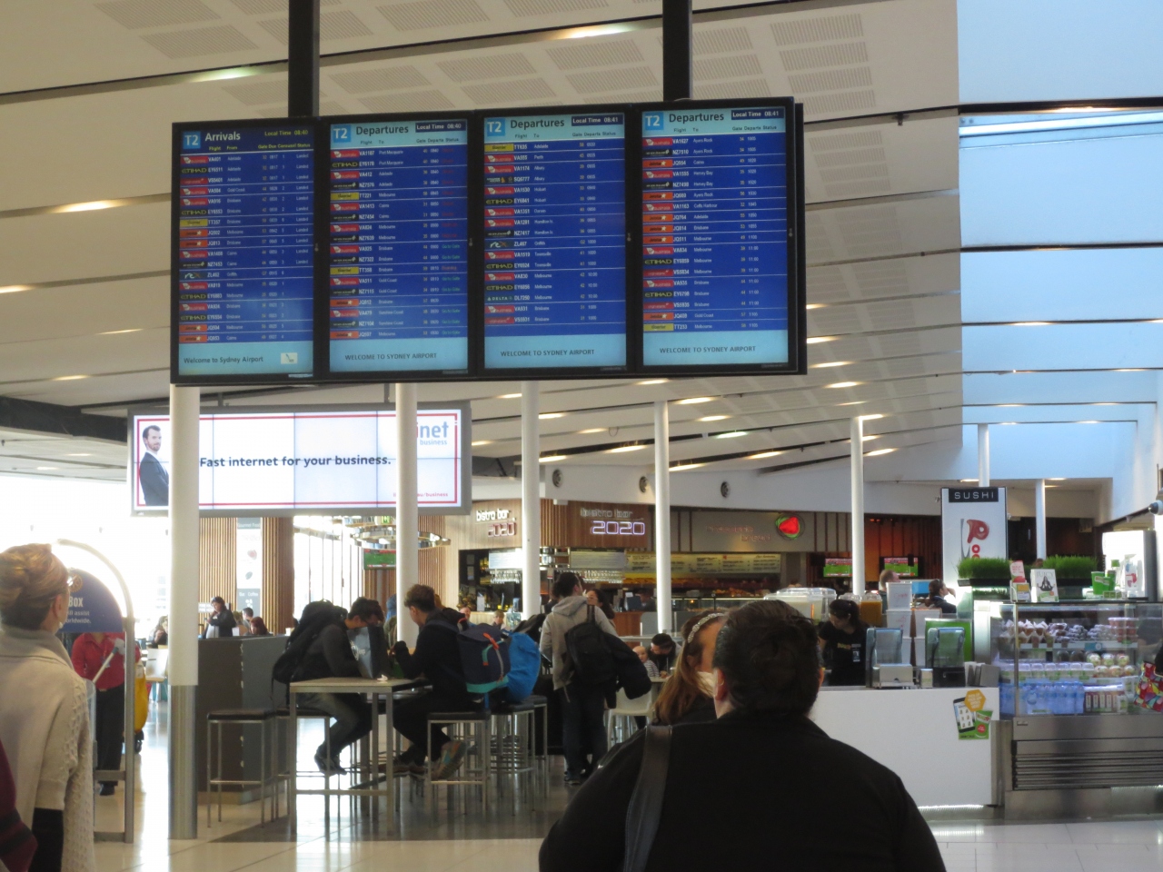 タイ国際航空でバンコク経由でシドニーに入り、そのままエアーズロックにヴァージン・オーストラリア航空で向かう旅程だったのですが、ガイド本等には国内線T2、T3ターミナルへは、Tバスというターミナル間バスで移動と書いてあります。ただし、実際に到着してみると、この「Tバス」の乗り方・乗り場が分からず、でかいスーツケースをゴロゴロ引きながら広いターミナル内を右往左往することに。レンタカー屋のおじさんにヴァージン・オーストラリア航空のeチケットを見せたら、T1ターミナル内にあるヴァージン・オーストラリア航空のチェックインカウンターまで連れて行ってくれました。ここで、大きな荷物とはお別れでき、今度はチェクインしてくれたヴァージンのおじさんがバスチケットを渡してくれた後、バス乗り場まで案内してくれました。(とはいえ、カウンターの壁の裏側あたりがバス乗り場だったのですが)。てっきり、T2まではスーツケースを持って移動と思ってました。