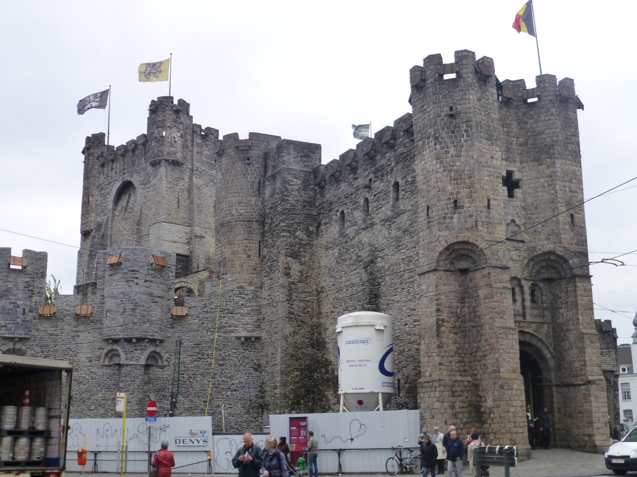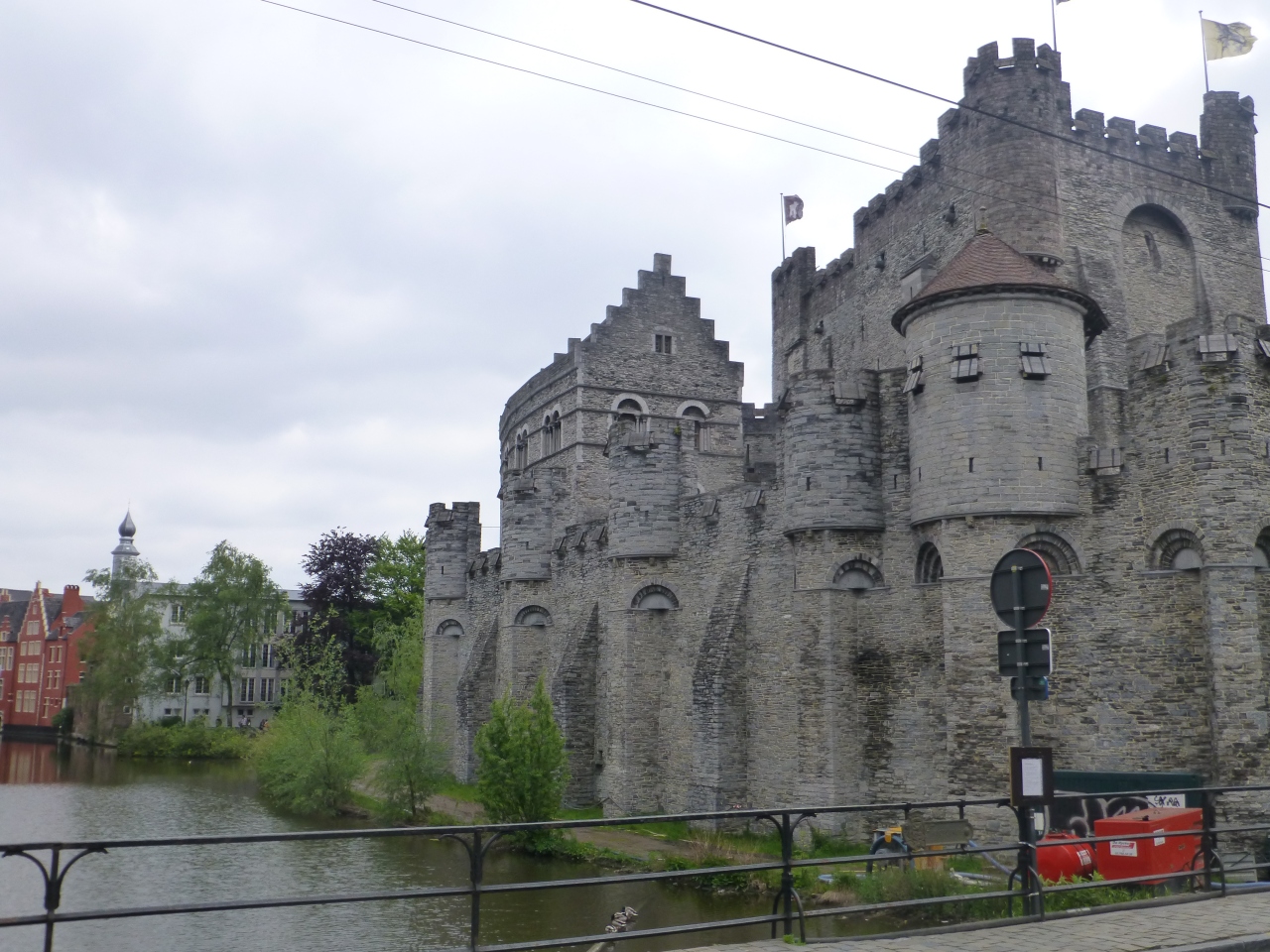 中ぐらいの交差点(トラム、車と自転車)(広場?)に着くと、真っ先に眼につくのは`岩造りのお城`でした。12世紀に築城されで「フランドル伯居城」です(ガイド曰く)。確かに、平坦な土地ですが(攻撃に不利) レイエ川沿いに有って`お濠`を巡らせすれば 頑丈なお城です。