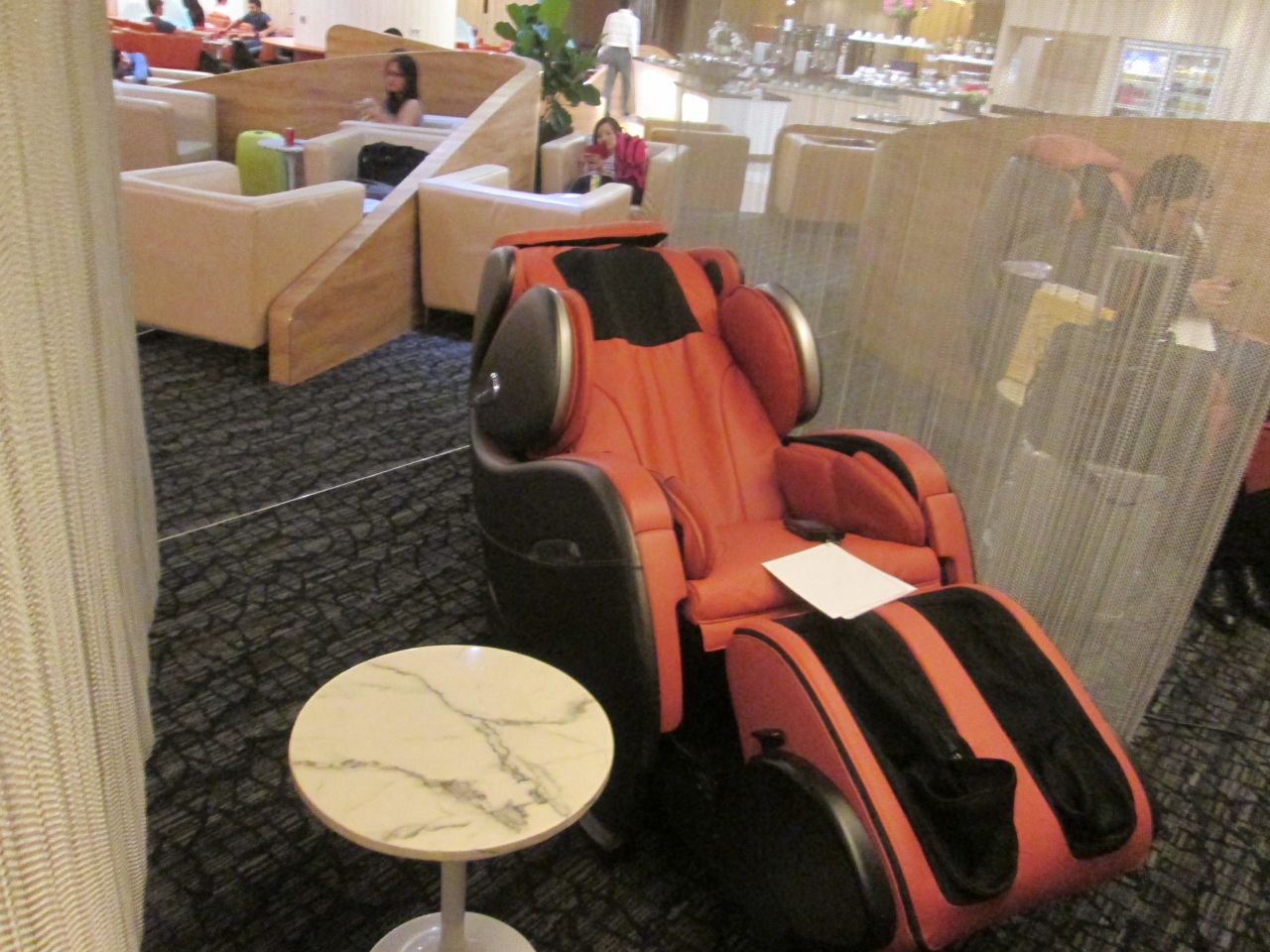JALが提携しているプレミアクラブラウンジにはマッサージチェアがあります。日本のファーストクラスラウンジにはマッサージ師によるマッサージですが、こちらは機械です。機械でも搭乗前にマッサージを受けると体が軽くなります。チャンギ空港内にフットマッサージ機が置いてありますが、ラウンジ内にも置いてありました。