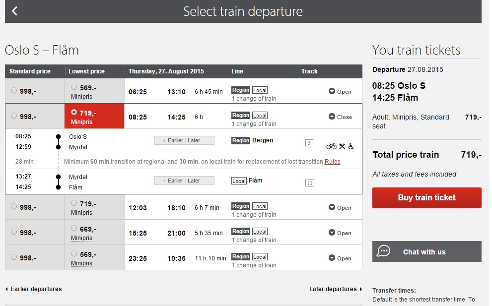 ノルウェー国鉄のStandard priceは変更可のチケットですが高いので、我々はLowest price(変更不可のチケット)にしました。