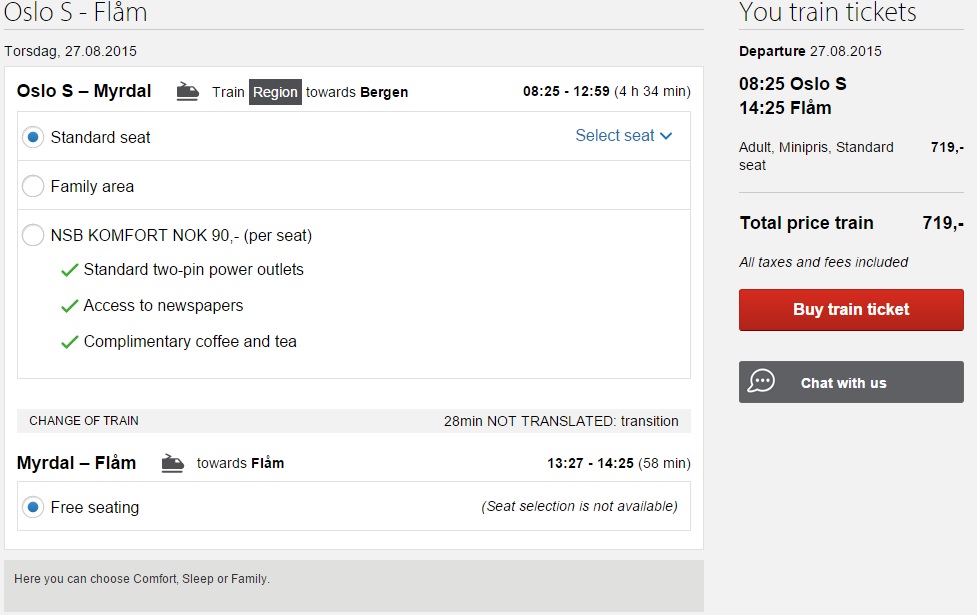 7月初めに利用するチケットを、5月末に予約しました。Standard seatでは左側の席が空いてなかったので、1人90NOK払ってNSB KOMFORTにアップグレードしました。すると希望通り左側の席が予約できました。
