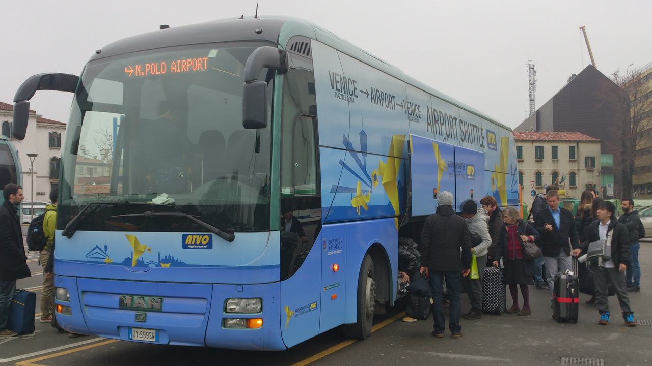 ヴェネツアの玄関口であるマルコ・ポーロ空港からヴェネツィアの中心街へのアクセスは、船、バス、バスと電車の三つの方法がありますが、一番早くて安いのがバス。バスは、空港とヴェネツィアで唯一車の乗り入れが可能でヴェネツィア・サンタ・ルチア駅に近いローマ広場を約20分で結んでいます。バスは、青の車体のATVOバス(シャトルバス)とオレンジ車体のACTVバス(市内バス)の二種類がありますが、運賃はどちらも同じ片道6?、往復11?で、ATVOはスーツケースの収納庫があるのに対し、ACTVは大型荷物は別料金(1?)で、旅行者にとってはATVOの方が便利。空港の荷物をピックアップするところに自動販売機があり、ここからか、到着ゲートを出たところの窓口からチケットを買います(ACTVのチケットではATVOは乗れないので注意)。到着ゲートを出るとバス乗り場があります。ローマ広場の近くには水上バス乗り場があるので、こちらからヴェネツィアの中心部に行くことになります。