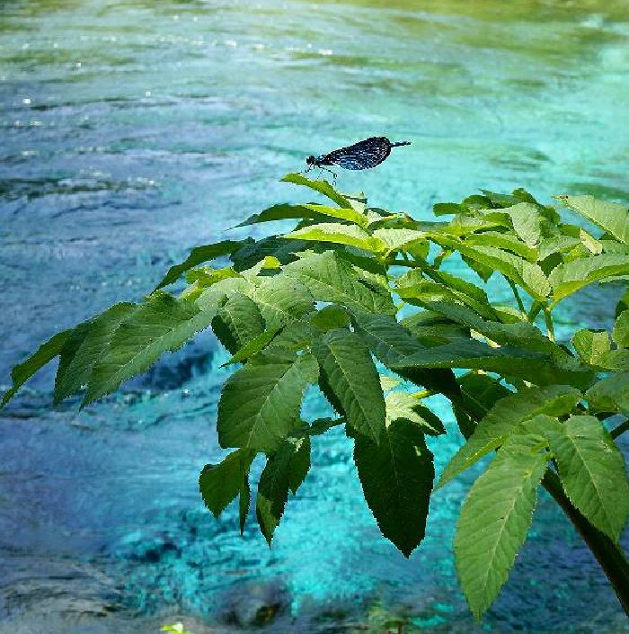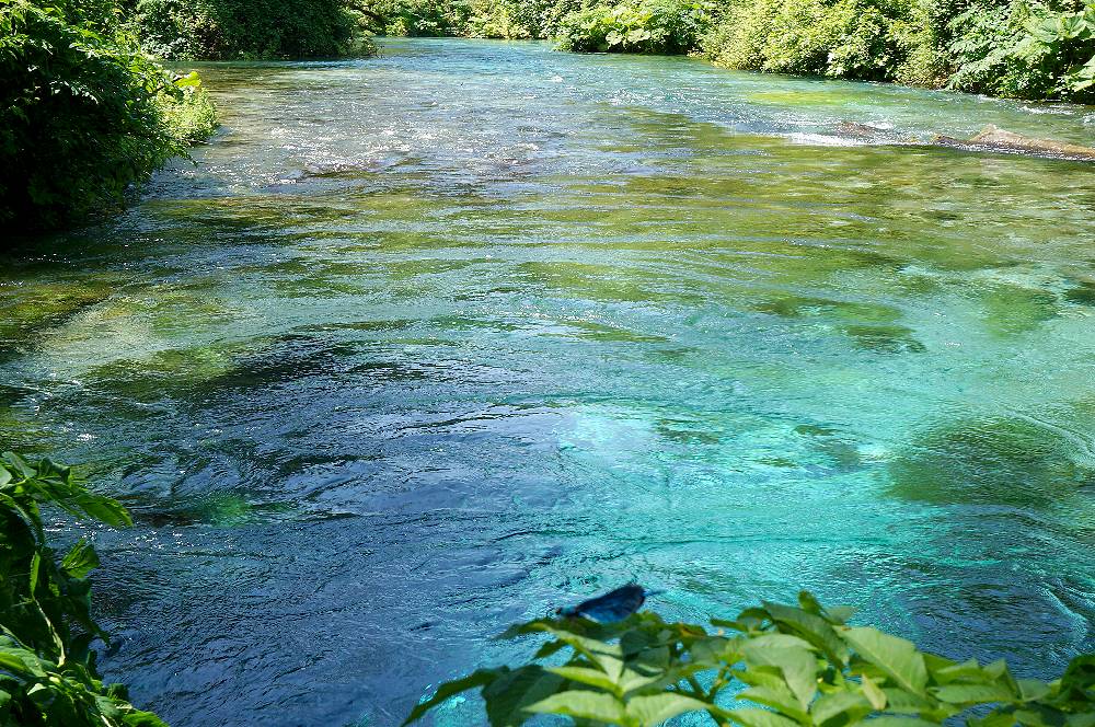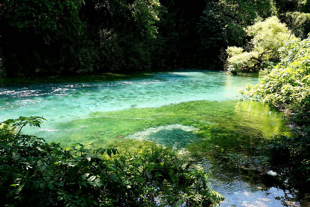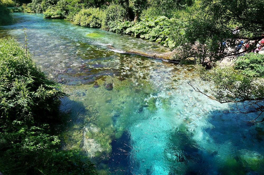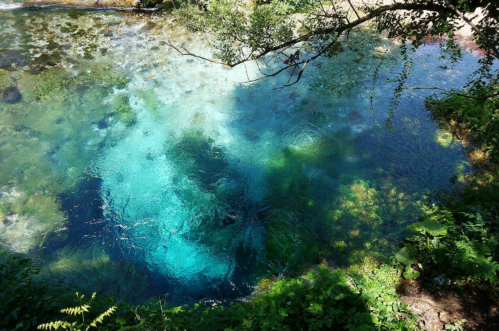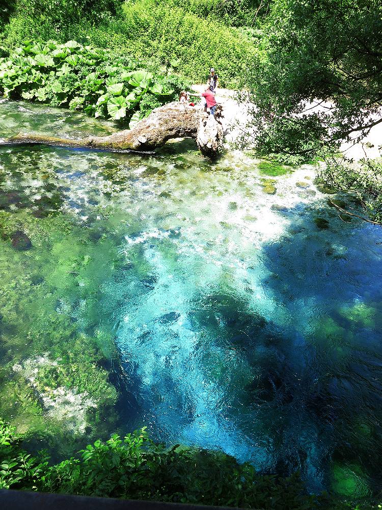 2015年6月初めにサランダからレンタカーで行きました。舗装道路を20キロ位走り、案内板からは未舗装路を3キロ位走ると駐車場とカフェがあります。そこから橋を渡り、巨大なふきが生える森の中へ数分歩いて行ったところがブルーアイです。手前の川も素晴らしい色で、玉虫色のトンボ?があちこちで飛び回っています。ブルーアイはきれいな水がこんこんと湧き出ている泉で、上から見下ろすための小さな展望台も設置されています。近年バックパッカーの隠れた人気スポットになっています。アクセスが悪く、バスとヒッチハイクの組み合わせか、タクシーかレンタカーで来るしか、来る方法がありません。