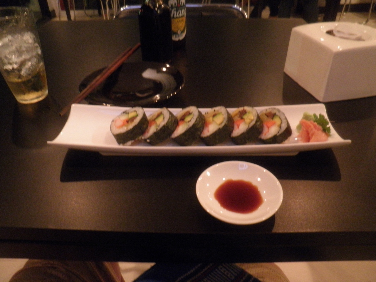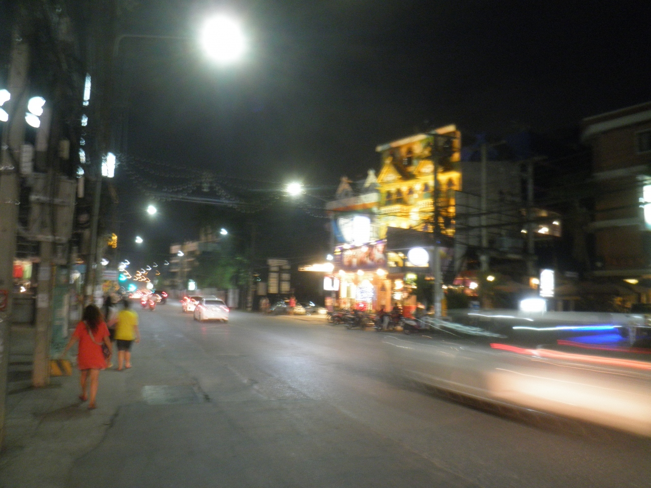 旧市街から少し離れていますが、ホテルやレストランなどが多くあるエリアです。 この通りから伸びる小道にもお店がならんでいます。街灯が少なくて暗いけれど、本通より自動車が少なく歩きやすかったです。 ガイドブックに載っていたバーを探したけど、ソイの表示が少なく探し出すことができませんでした。 日本食のレストランも何軒かあって、その一軒に入ってカリフォルニアロールとビールをいただきました。あまり夜遊びむきのお店は見当たりませんでした。