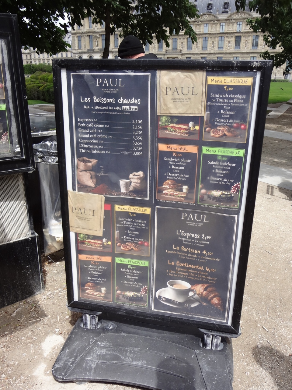 チュイルリー公園に、PAULのスタンドがあります。パンやデニッシュとコーヒーやジュースを購入して、チュイルリー公園のベンチに座ってルーブル美術館のピラミッドを眺めながら、ランチにしいました。簡単なランチにいいです。