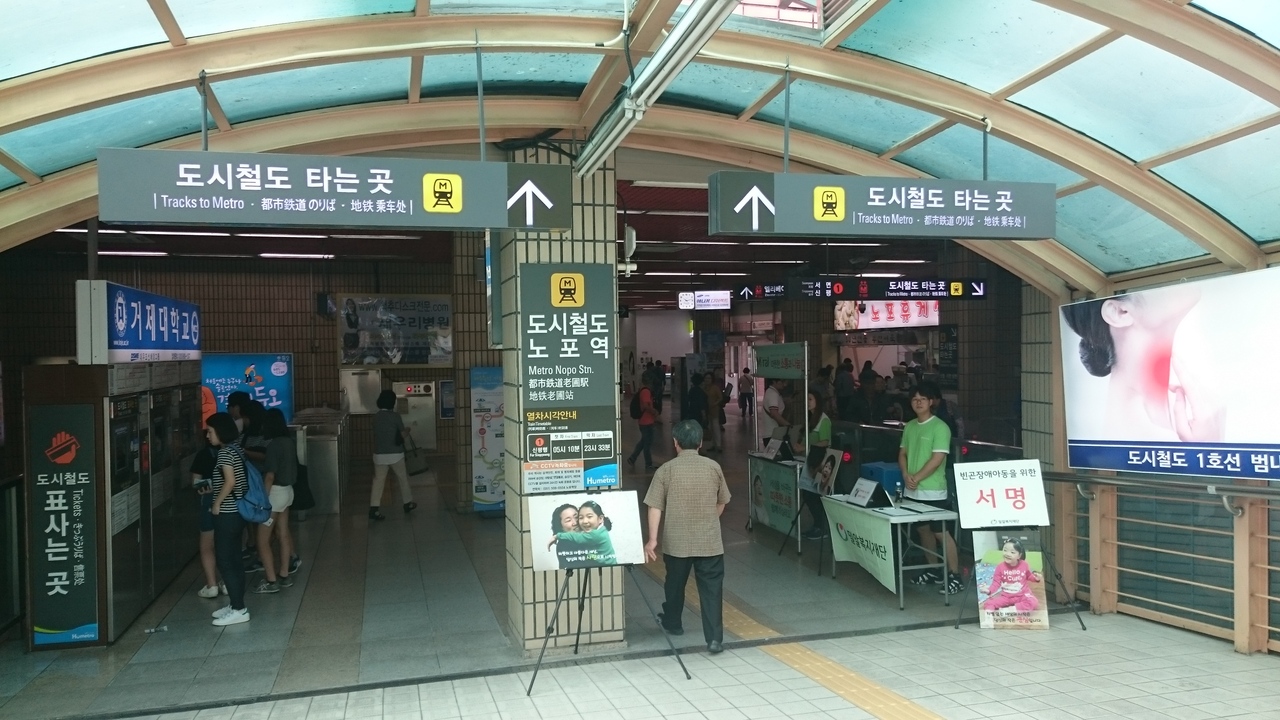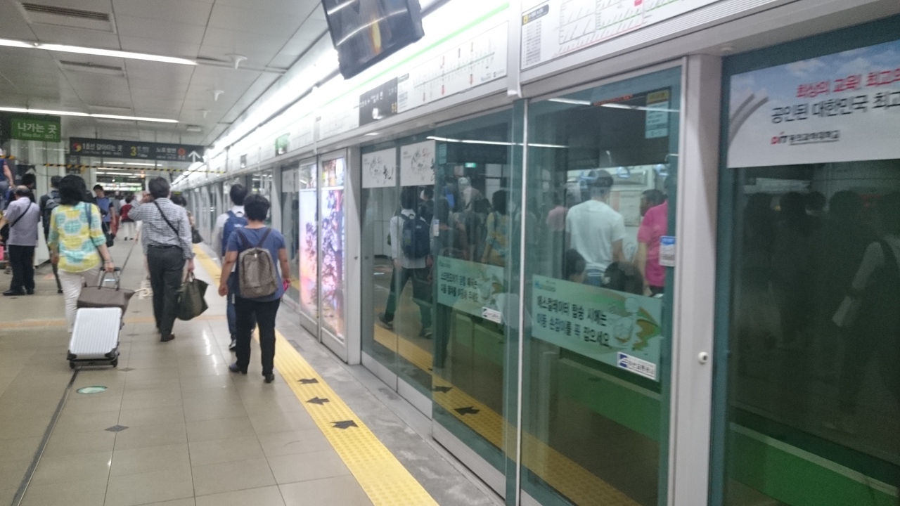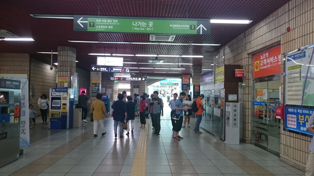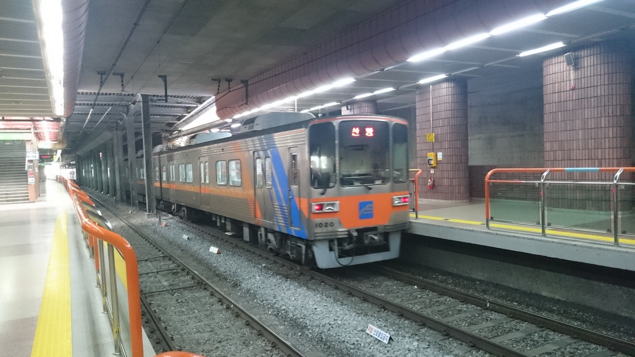 1号線は釜山市内を南北に走る路線で、チャガルチ市場、南浦洞国際市場、釜山タワー、東菜温泉などの観光スポットに加え、KTXの始発駅でもあるKORAILの釜山駅や釜山総合バスターミナルのある老園などを通ります。ロッテ百貨店やロッテホテルのある西門が、2号線との乗り換え駅になります。東京メトロの東西線5000系をイメージさせるような少しゴツい車輛で運行されています。