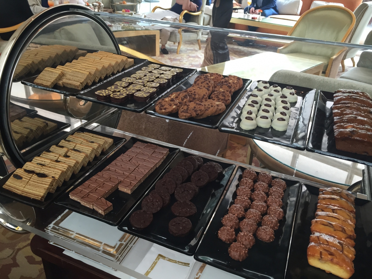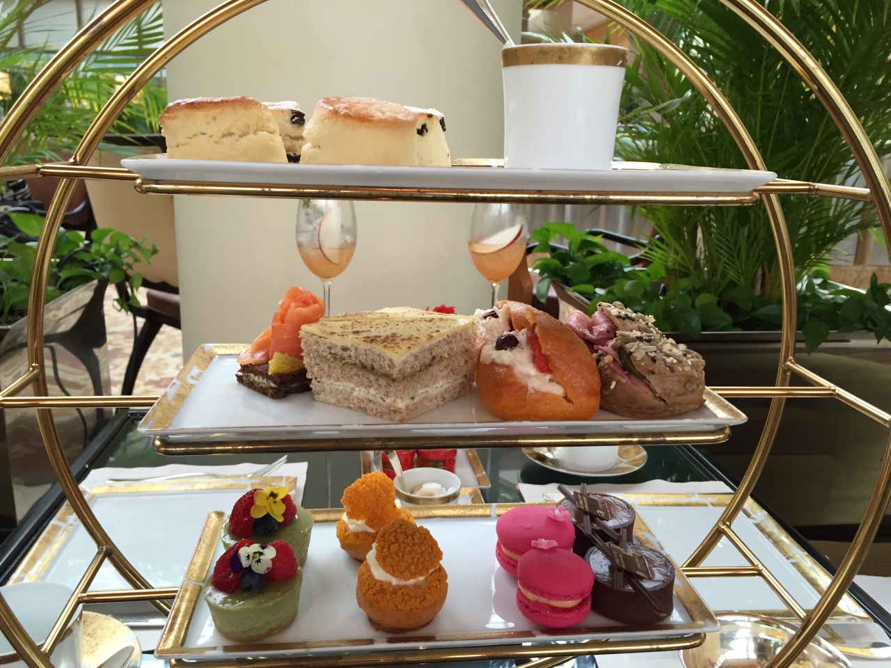 ・三段トレイには上からスコーン・サンドイッチ・プチフールが乗っていました。これ以外にも途中でクリームが乗ったベリー、ココナッツソルベが提供されます。が、一番最初から乗っているサンドイッチが1つ足りない!ホテルスタッフも「あ、ごめんなさい。ひとつ足りなかったわ」と気付いてるのになかなか持ってくる気配が無いので、他のスタッフに頼みました。