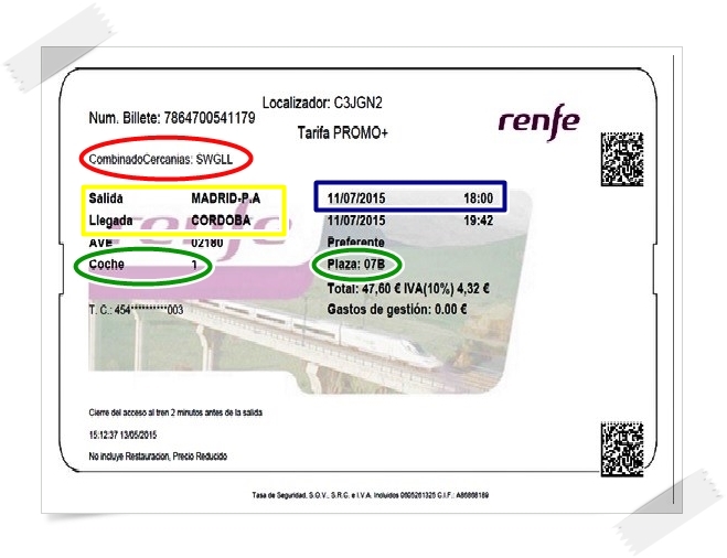 プリントアウトされた切符の中に【CombinadoCercanias】 と書かれた文字があれば、その切符は、セルカニアスただ乗りの対象切符だ。