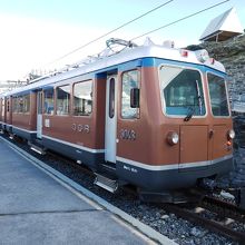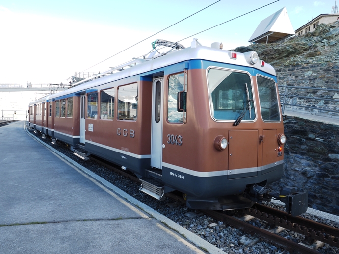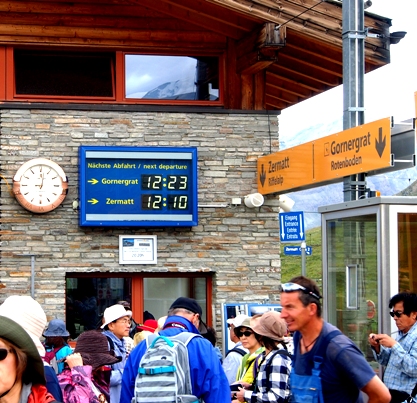 33分?でツェルマットからゴルナーグラート展望台前駅まで運んでくれます。ツェルマット駅のホームではたくさんの乗客で「座れるかしら?」と心配でしたが,ちゃんと座れるようになっているようです。臨時便も出ているようでした。さすが観光立国。
