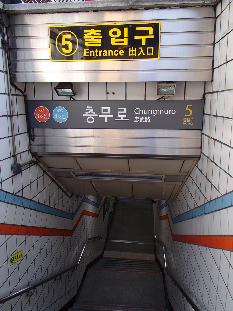ソウル地下鉄の忠武路駅は3号線と4号線が交差している乗り換え駅で明洞の一つとなりの駅です。