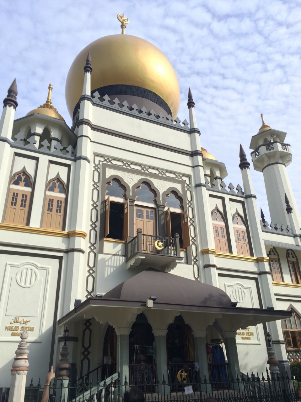 金色に光るタマネギ型ドームが美しいモスクです。1824年に建立されたシンガポール最古のモスクだそうです。7月18日に訪れましたが、修復工事は終わっていたようです。ラマダン明けのハリ・ラヤ・プアサの翌朝だったせいか、観光客用の入り口は閉じられていて内部は見学できませんでした。