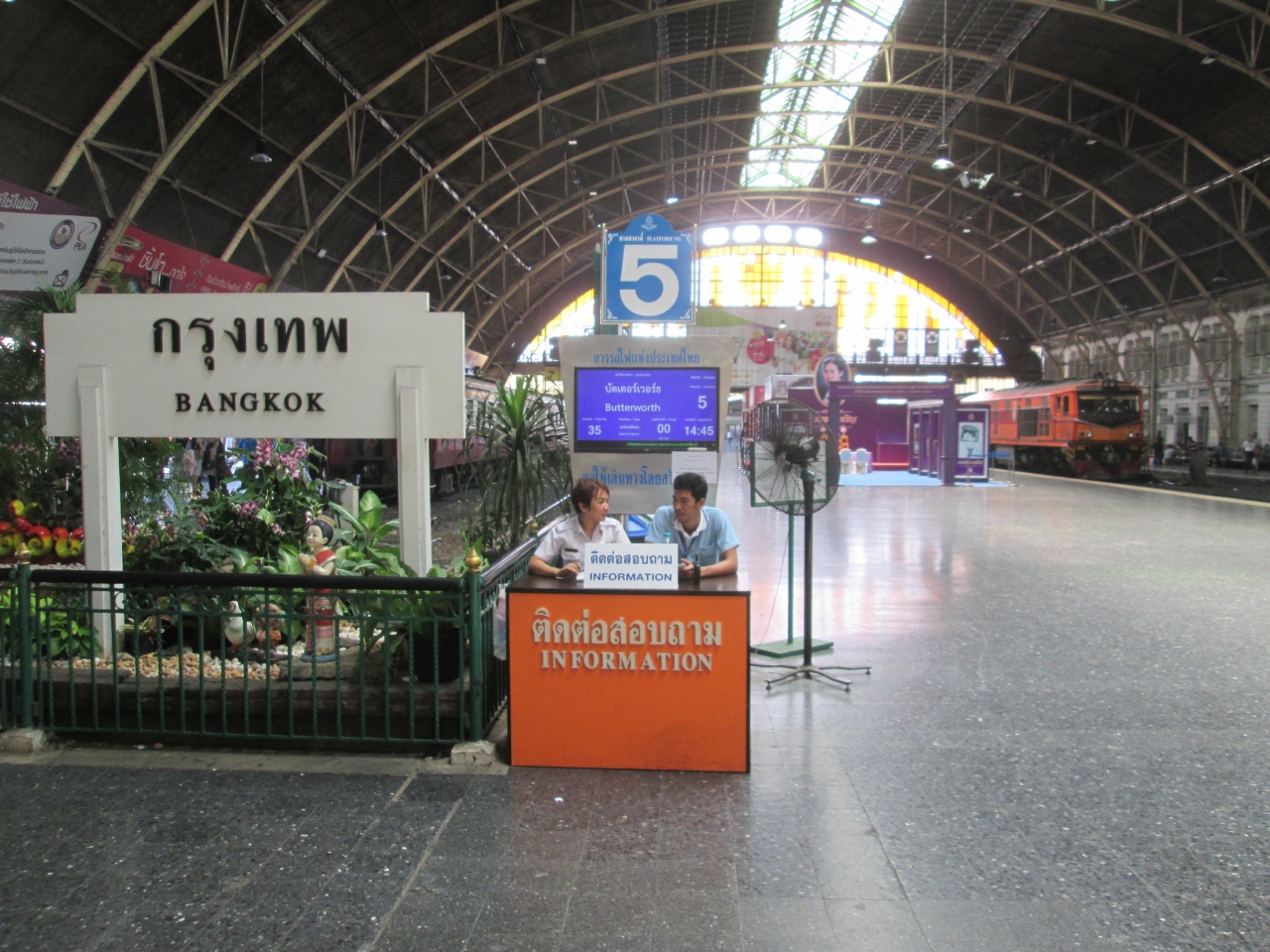国鉄ファランポーン駅の臨時インフォメーションカウンターであってもスタッフが待機しています。2人待機していました。6月に国鉄ファランポーン駅に訪問すると、インフォメーションカウンターの上に電光掲示板が設置されていました。