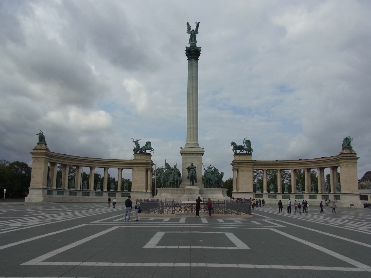 地下鉄1号線の英雄広場駅から外に出るとすぐに英雄広場です。ハンガリー建国1000年祭の一環事業として1896年に造られました。記念碑の真ん中には柱頭に大天使ガブリエルを頂き、マジャル族7人の部族長が並んでいます。