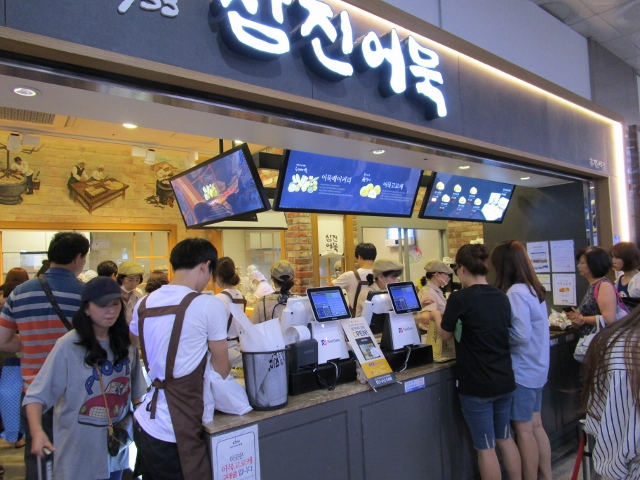 釜山駅で何やらすごい行列が・・・影島に本店があるサムジンオムク(サムジン蒲鉾)の釜山駅ショップです。2階にあるのですが、ものすごい混雑。