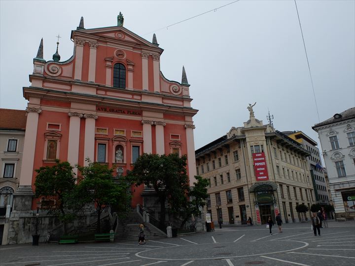 リュブリャーナ観光の基点プレシェーレン広に面して立っている教会が聖フランシスコ教会。