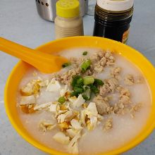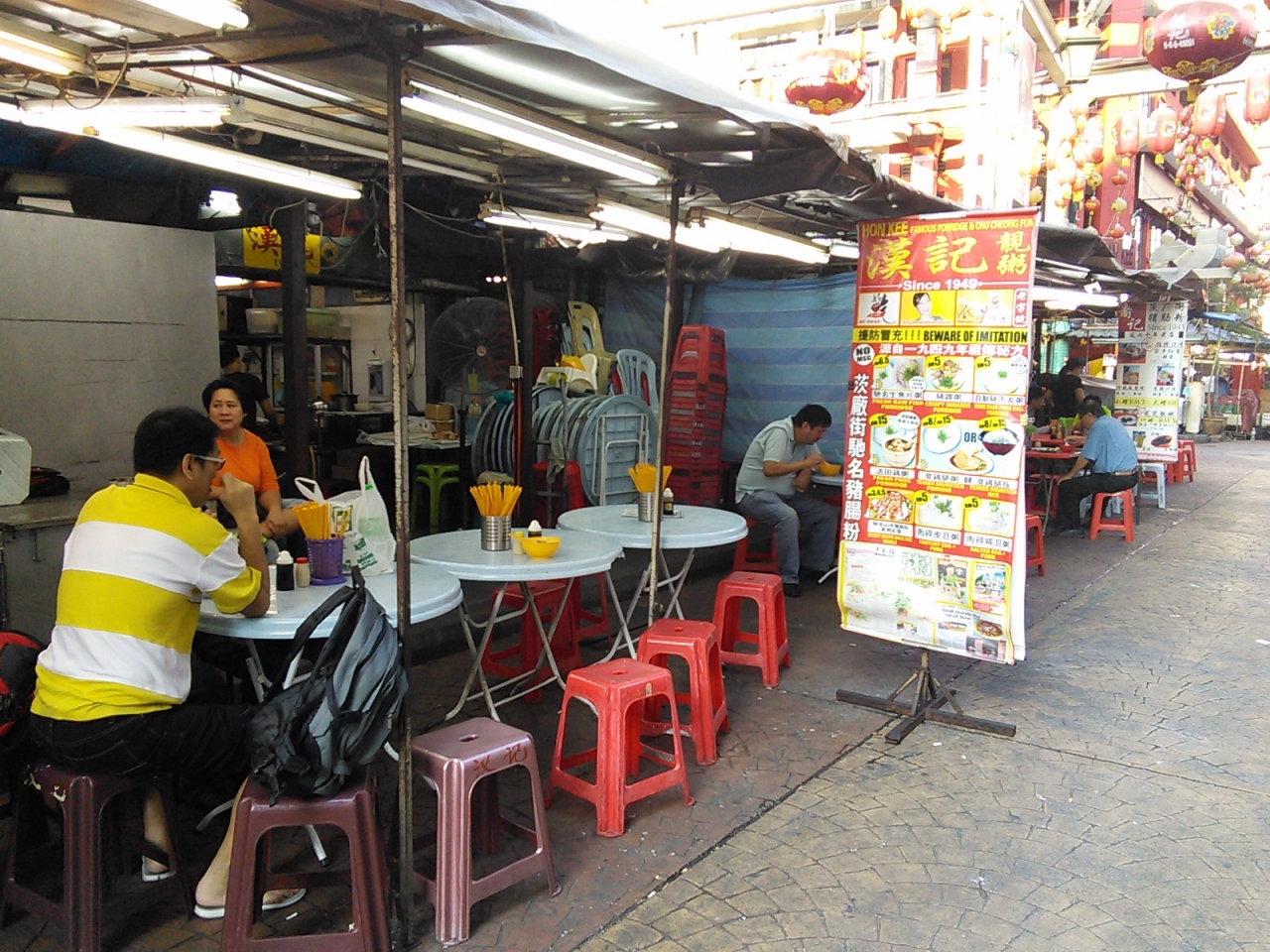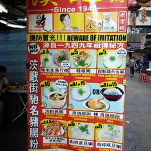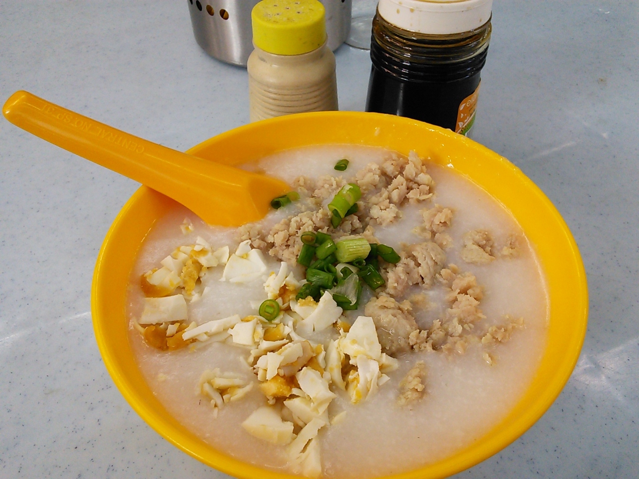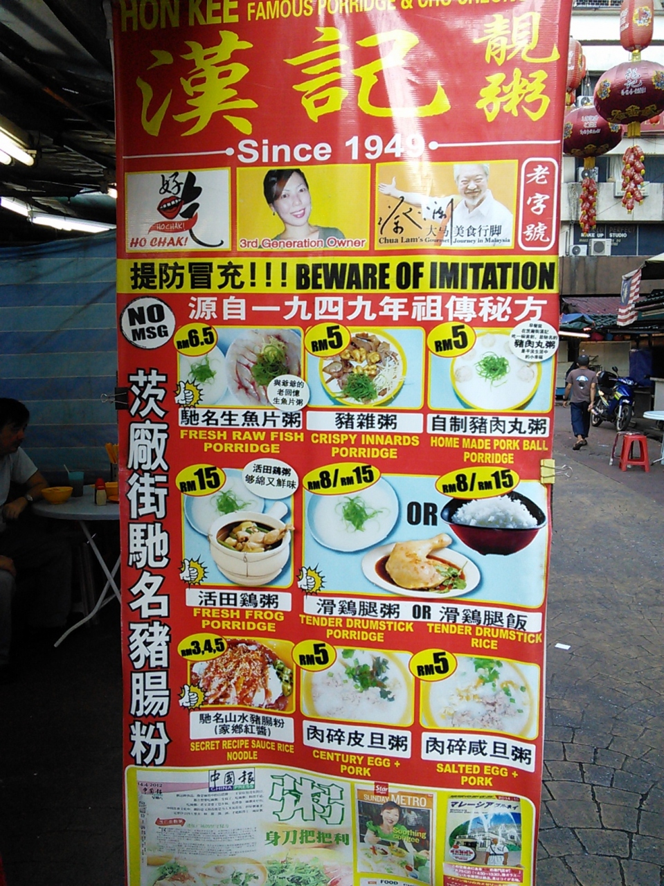 お粥の有名店。「歩き方」でも紹介されています。店の前で立ち止まっているとおばちゃんが声をかけてきます。どうせ食べるつもりだったのでメニューがわりになっている看板を見て「Salted Egg+Pork」5RMをオーダー。1分もしないうちにあっという間に運ばれてきました。豚挽き肉と砕いた塩漬けのゆで卵が入っておりネギがパラパラ。味はシンプルですがまあおいしいです。で、ひとつ気になるメニューが…、茹でた米粉麺に特製ソースをかけたものですがその名も「Secret Recipe Sauce Rice Noodle」どんなソースなのか気になる~。量によって3,4,5RMから選べます。