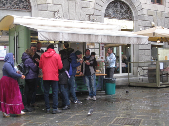 イノシシをなでていて、気づいたらトリッパの屋台があったのでここでランチに。トリッパは3€。私にはちょっと塩が強めで油っぽいが男性陣はこれがよいらしい。お店のお兄さんがとても感じよくてパンもあたためてくれた。