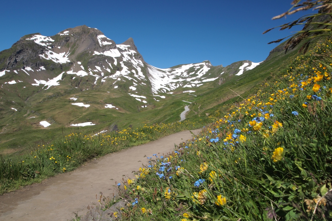 ゴンドラでフィルストまで行き、そこからバッハーアルプゼーまで単純往復しました。概ね平坦、ところどころ緩やかなアップダウンの道では花々が咲き誇り、小川がせせらぎ、崖の上からグリンデルワルトの町を見下ろしながら、写真を撮りながら、、、ゆっくり歩いても1時間ほどで到着。