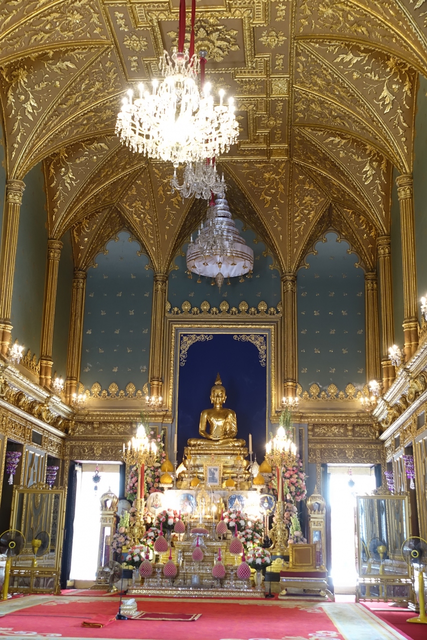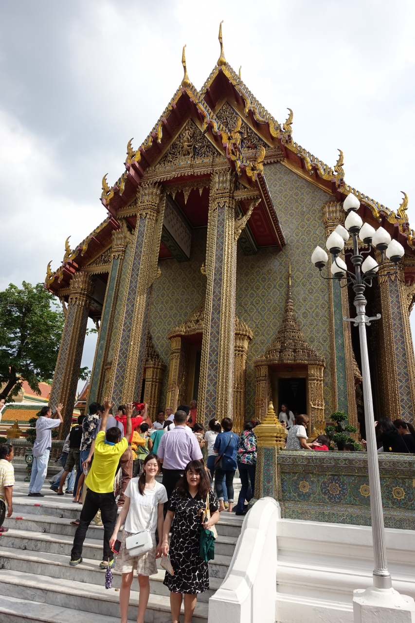 本堂の外壁は色彩豊かな中国製タイルが用いられ 、本堂の内部は至る所にタイベンチャロング焼きで装飾され、天井からはシャンデリアがぶら下がっているモダンな寺院です。王宮やワット・ポーの近くで歩いて行くことができる距離です。 なお、拝観料などは徴収されません。