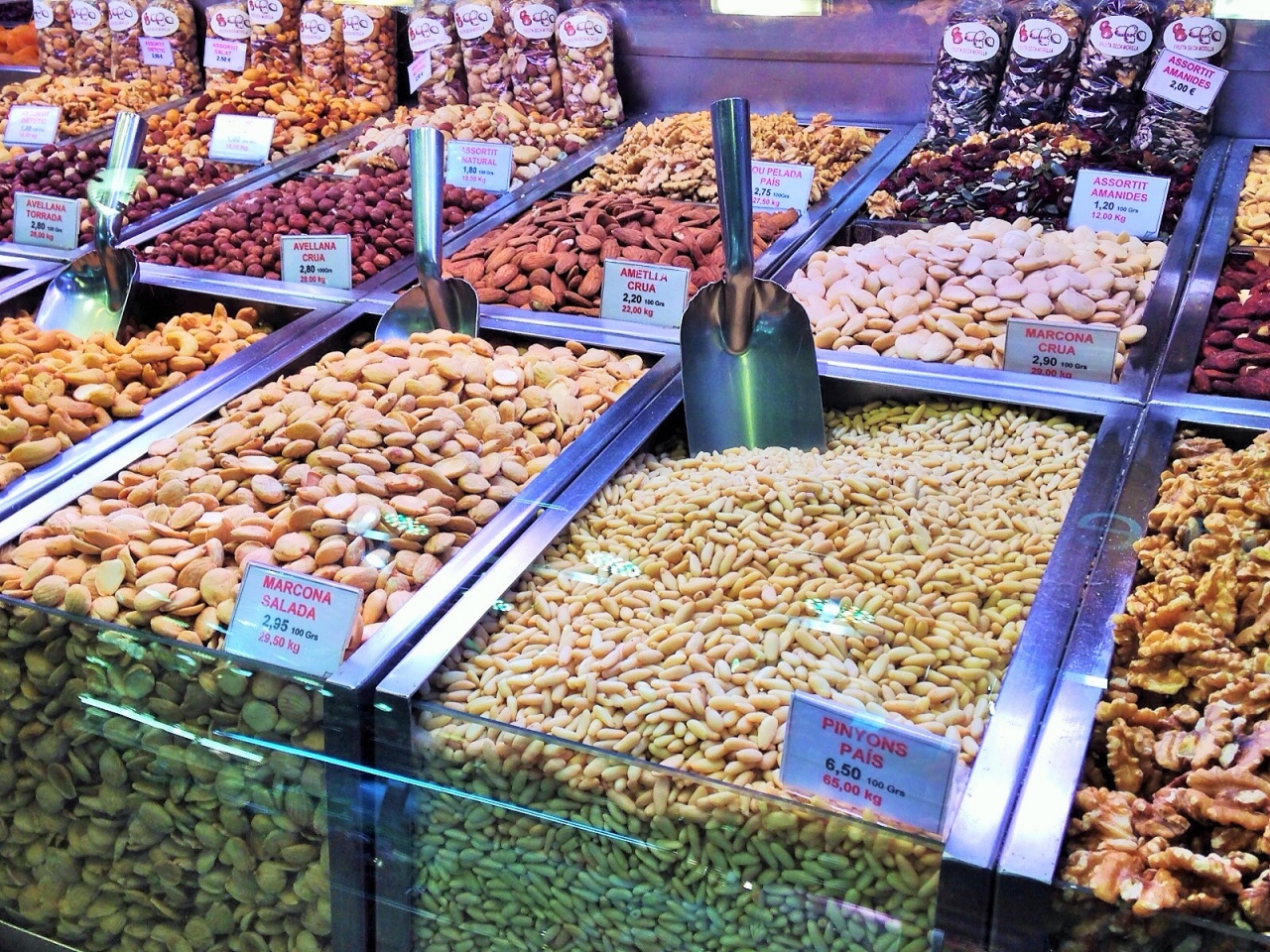 オススメのものはナッツ類、特にカタルーニャ産のマルコナ種アーモンドは日本で買う値段の半額位(100g/3ユーロ程度)で買えて、味もアメリカ産に比べて格段に美味です。同じく松の実も美味なのですが、こちら100g/6.9ユーロとアーモンドの倍以上の価格…でも。中国産とは全然別物なのでトライしてみてください。日本に持ち帰るときは湿気り対策をするか、帰国後に軽く炒ると良いです。