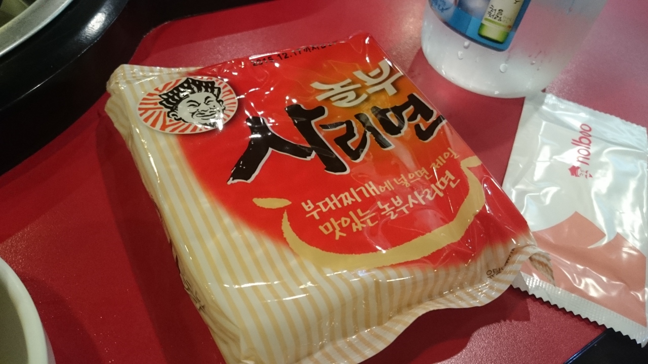 プデチゲのレストランチェーンとして有名な「ノルブプデチゲ&チョルパングイ」の東大門近くの乙支路6街(ウルチロユッカ)にあるお店。地下鉄駅から徒歩数分、ビルの2階にありますが、おじさんが描かれた赤い看板を目印にすればすぐ見つかります。年中無休なうえ、韓国では珍しい一人客でもOKのお店です。店員さんにおすすめを聞いたところ、肉を入れたチゲのほうが美味しいと言われたので、ノーマルブテチゲよりも1000ウォン高い8000ウォンのブテチゲに1000ウォンのラーメンを追加しました。白いスープを入れるとだんだん赤くなっていきますが、思ったほど辛くない。スパムや野菜、キムチ、納豆の味がラーメンに移っていて美味しい。韓国B級グルメの代表です。