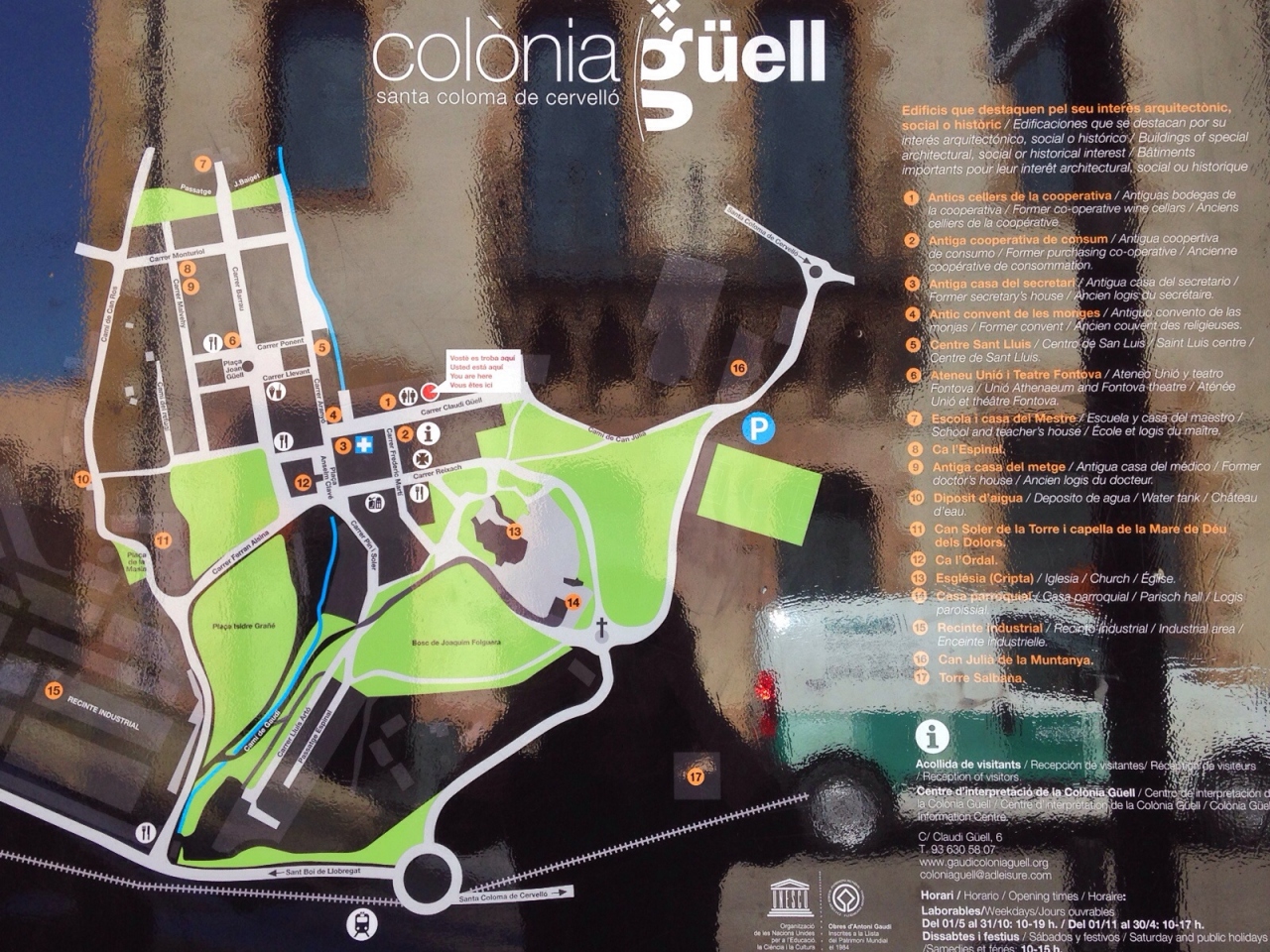 バルセロナからは郊外鉄道に乗って30分ほど。その名もコロニア・グエル駅が最寄りなのですが、その1つ前のMoli Nou-Ciutat Cooperativaという駅でも同じくらいの距離です。これだとZONE1の料金でOKなので、回数券を持っているときはこちらの利用をおすすめします。
