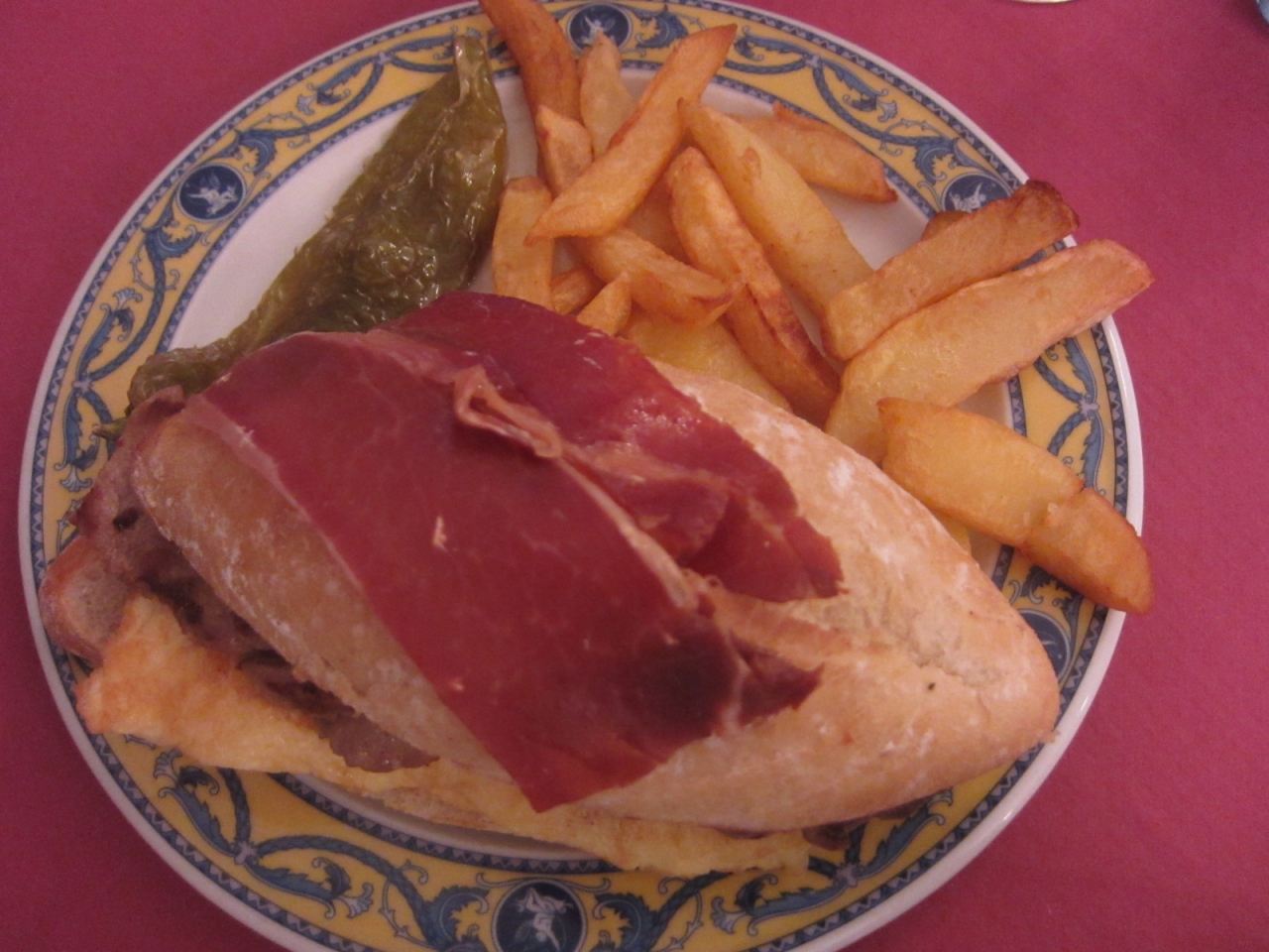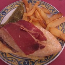 夕方近い昼ごはんになったため、遅い時間までやっていたこちらにしました。セビリアにはセラニートというサンドイッチがあるということで注文。焼いた豚ロースに生トマト、卵焼きを挟み、生ハム、素揚げしたピーマンをのせたものです。ここはチキンもあるということでしたが、最初に調べていた豚に。ちょっと豚臭かったですが、卵焼きが入っていることで調和されて食べやすかったです。ボリューム満点でしたがお腹空いていたのでペロッと食べられました。赤ワインのソーダ割りはここのお店は薄かったです。