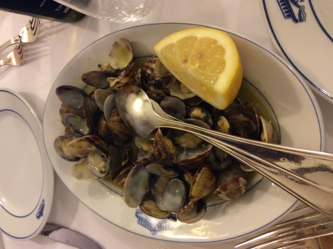 アサリのワイン蒸し、クモガニサラダ、イカスミスパッゲッティ、ワインを1本頼んで、70ユーロ。スパゲッティは一人分を頼んだら、何も言わなくても2皿に分けて持ってきてくれました。量はそれでちょうど良かったから、一人一皿なら多かったでしょうね。