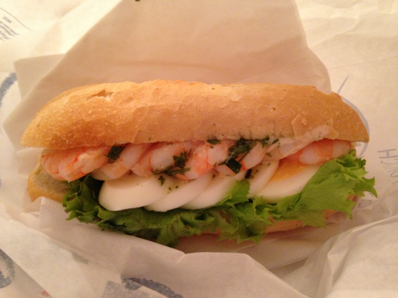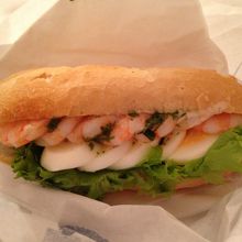 夕食用に写真のエビサンドを持ち帰り、これで3.99ユーロでした物価の高さを感じました。これと同じ種類でサーモン、珍しいところでニシンのようなものもありました。サンドイッチまたはラップで同じ種類があります。味は可も不可もなくでした。