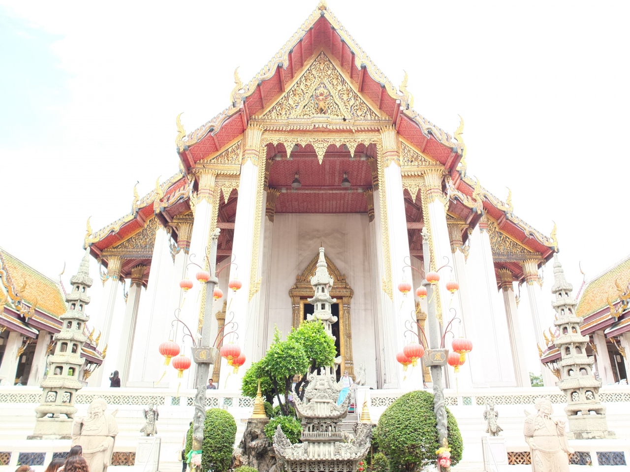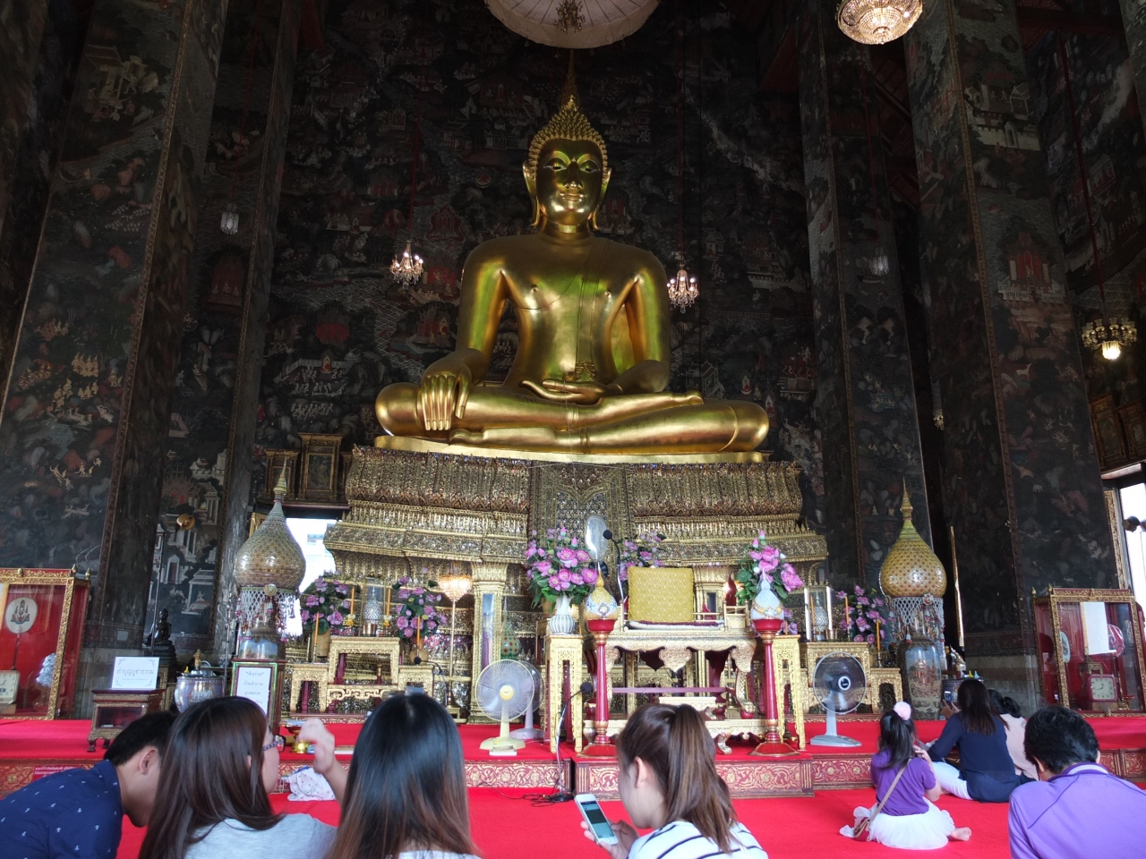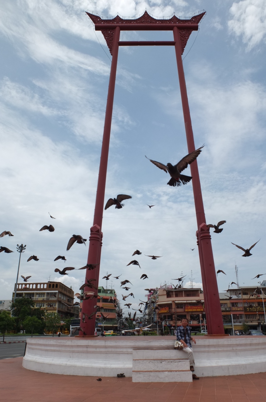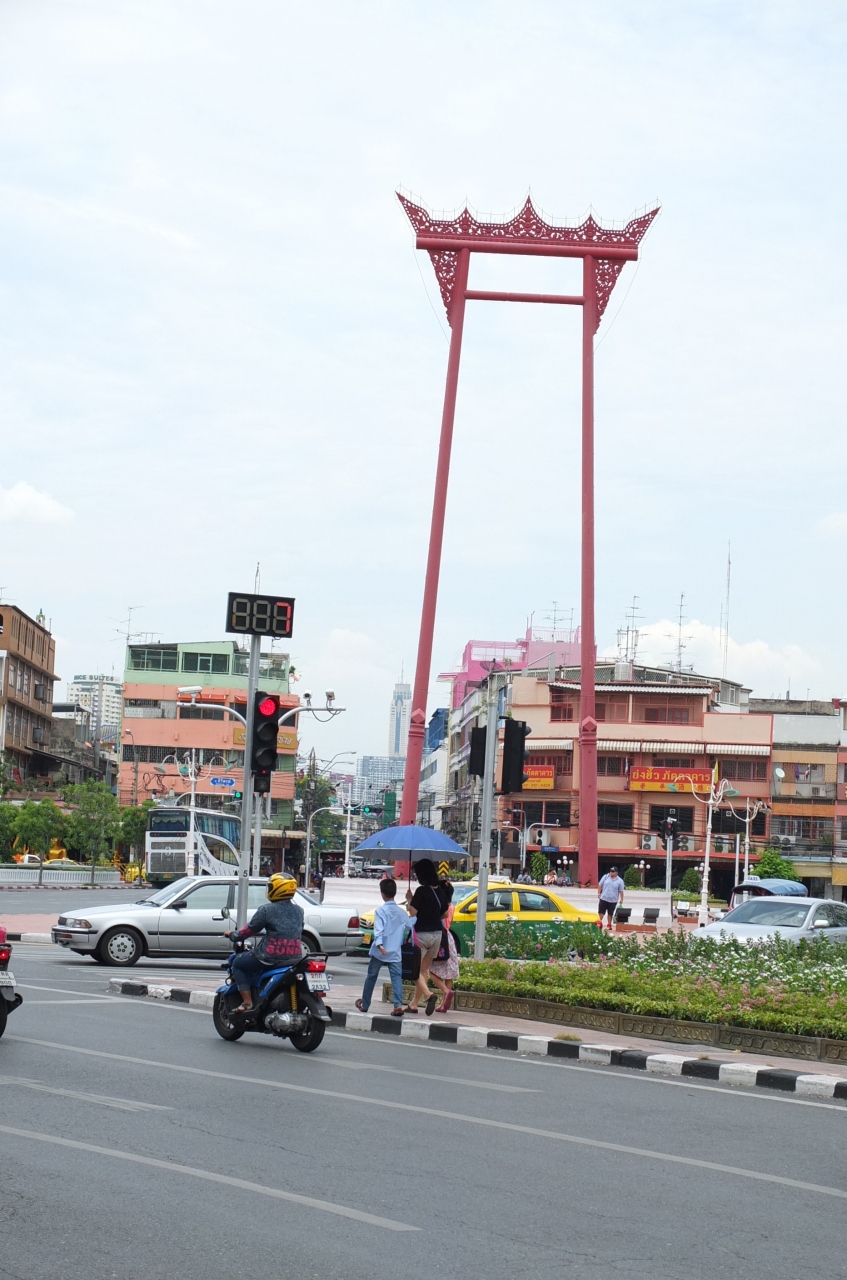チャオプラヤエクスプレスのターチャーン船着き場から徒歩で行くにはワットプラケオの正面入り口の前を通り過ぎて右折、タイ王国国防省庁舎を過ぎたら左折してカンラヤナマイトリー通りからバムルン・ムアン通り(仏具街)に向かいます、すると仏具街に入る辺りからサオ チン チャーは見えてきます、仏具街にはいろいろな姿の仏像が並んでいてこれを見ながら歩くのも面白いです、仏具街を過ぎるとサオ チン チャーがあります、ワット・スタットの前の道路のロータリーの中にあります下から見上げると想像していたよりもかなり高く見えます。ワットスタットは入場料が30バーツ必要ですが本堂は大変きれいな作りで中には高さ8メートルの仏像が祀られています。