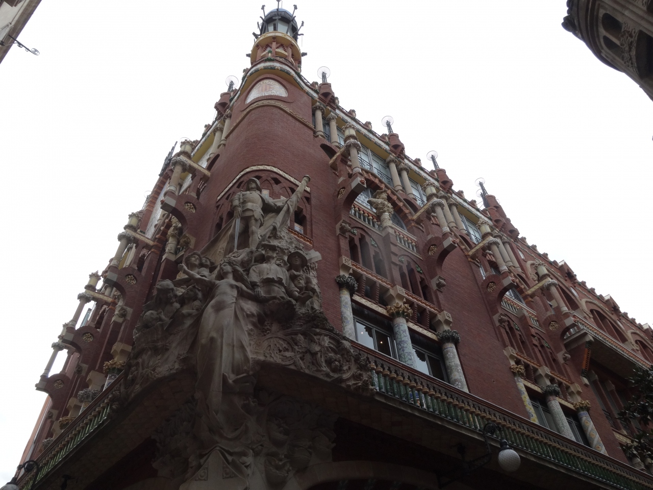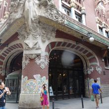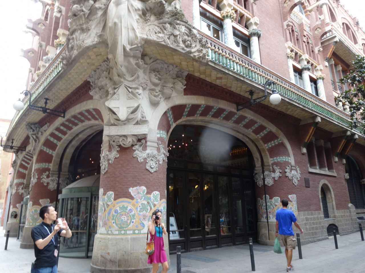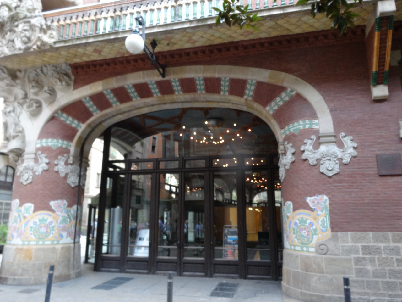 わかりにくく狭い路地のようなところにありました。モデルニスモ建築群の一つで、ここは、ガウディーのライバルと言ってもいいモンタネールが建築したコンサートホールです。中に入ることはできませんでしたが、外観だけでも見る価値は十分あります。