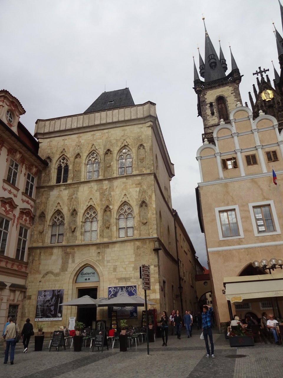 隣の建物の後ろはティーン教会なので全体像を写真で撮ると、斜め後ろにティーン教会の尖塔が写っています。
