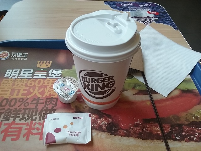 上海ではStarbacksやCostaなどのコーヒーショップも多いのですが、値段が中々高め。コーヒーの選択肢はすこぶる狭いのですが、バーガーキングがいつも比較的空いていますし、10元(200円)程でコーヒーを一杯飲めますので重宝します。