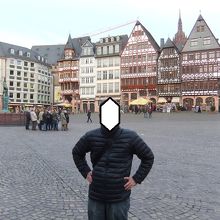 レーマー広場は、ここだけ中世の街が再現されていて、良い感じです。 木組みの家、教会の塔、大聖堂は、修理中でした。 カフェで、ひと休み。 雰囲気あります。