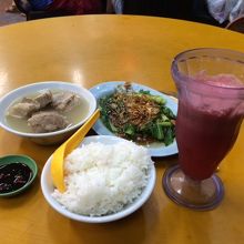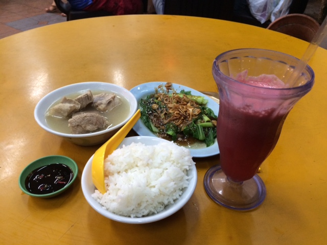 バクテーはシンガポールでよくある、胡椒の効いたスープに骨付き豚肉で、そこそこ美味しい。他のメニューや生絞りフルーツジュースもあったので、Kai Lanの炒め物とスイカジュースも注文。これらを注文して10ドル強なので、コストパフォーマンスも高いと言える。